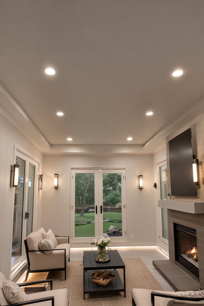The modern look of a 3 season porch is complemented by ambient and recessed features. Ceiling mounted lights ensure that there is no visible clutter, and wall mounted sconces along with LED strips add an inviting ambience. Finally, for a homely feel, mood and time of the day sensitive dimmable lighting allows for full customization.