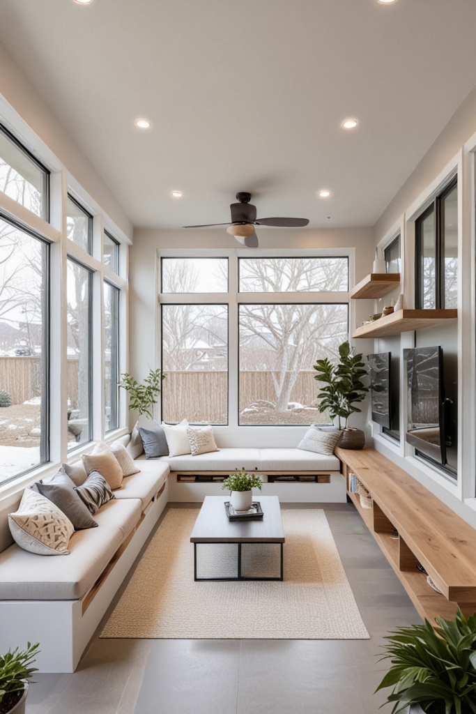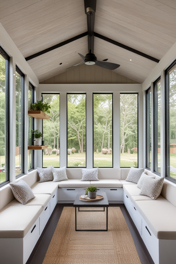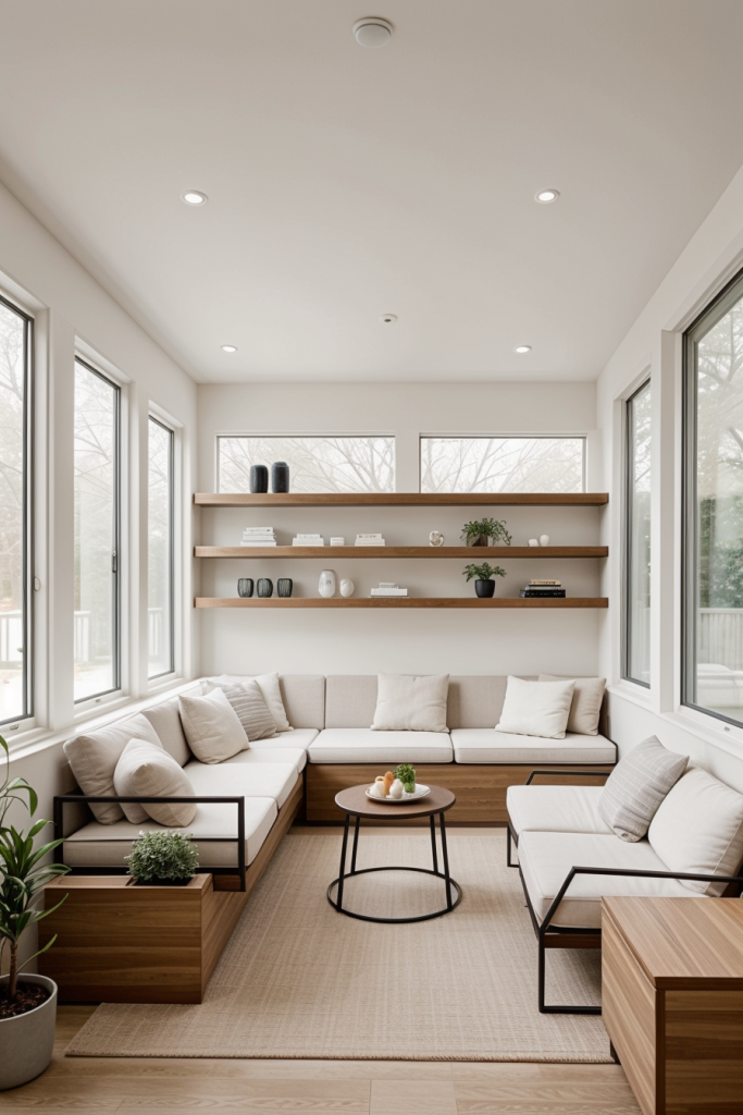 For an updated 3 season porch, open shelving and eye-level floating storage gives a clean organized appearance. Wood, glass, or metal floating shelves can showcase decorative objects, books or small plants without cluttering the space. Wall beds and builtin storage benches serve a dual purpose by keeping the space free from clutter and providing seating. Minimal decor helps maintain the open and light feel of the area.