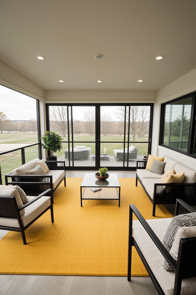 An outdoor rug can help to define the seating space of a three-season porch as well as make it feel warmer and textured. Consider neutral geometric low-pile, weather resistant rugs which have subtle textures, because these will match the contemporary aesthetic of the space. An outdoor rug placed appropriately can anchor the design so that the area is not only more usable, but is also inviting and durable in different temperatures.