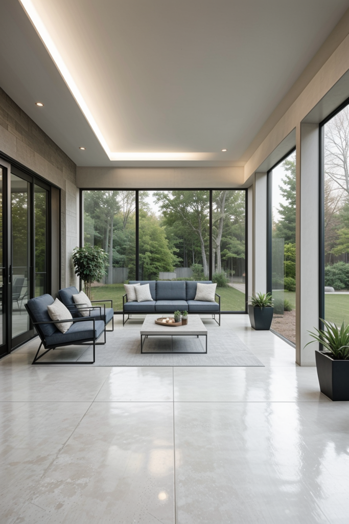 A modern 3 season porch is beautifully complemented by the use of concrete and stone as these materials offer a textural contrast. The natural aesthetic is further enhanced by a polished concrete floor, a stone accent wall, or a sleek stone coffee table. Blending these materials with soft fabrics and warm light boosts the cozy sophistication of the ambiente.
