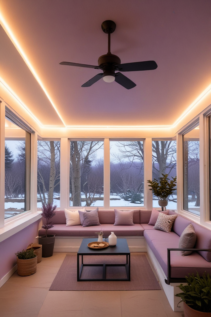 A 3 season porch can be beautifully lit with the use of LED strip lights which use modern and energy efficient technology. By putting LED strips beneath furniture, along the edges of the ceiling, or under shelves, one can effectively achieve a beautiful glow revealing the subtleness of the space. The nifty and sophisticated way of enhancing the lighting is done without disrupting the sleek uncluttered space.