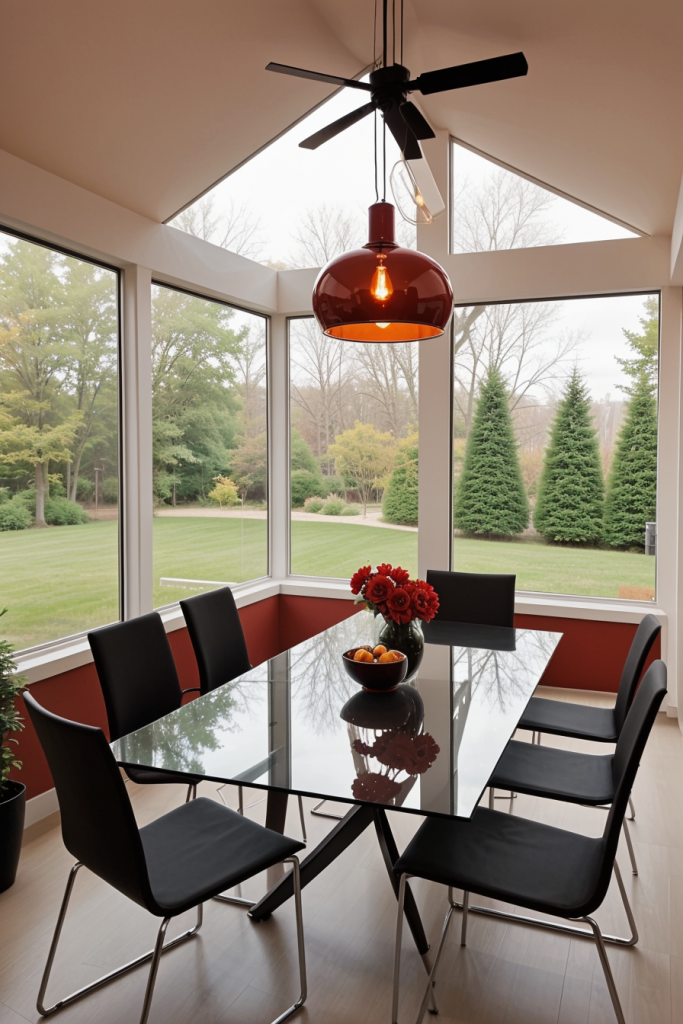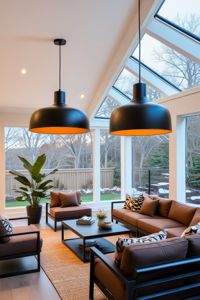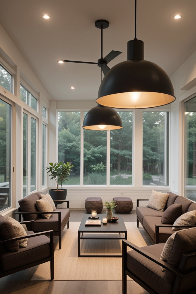 In a 3 season porch, pendant lights become the modern centerpiece when accented by elegant statement fixtures. Oversized geometric and sleek metallic designs, including glass pendant lights, serve as both decorative and functional pieces. Pedant lights that are merged with recessed or LED strips provide more illumination Set the mood with warm light to make the evening cozy for relaxation or gatherings.