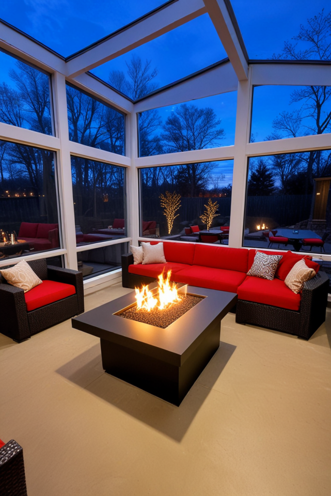 In a modern 3 saison porch, a fire pit can stylishly add warmth and create a cozy gathering spot. A minimalist fire pit optimally enhances the space. Choose modern gas or bioethanol fire pits in concrete, glass or steel finishes. An integrated fire pit table can also function as a source of heat for the seating arrangement while serving as a centerpiece, thereby increasing modern appeal.