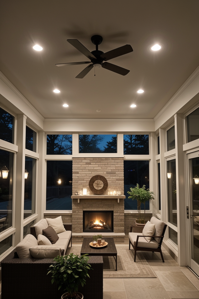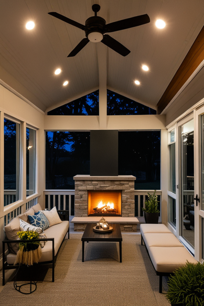 Adding a fireplace gives both decoration and warmth to a three season porch, making it usable all year round. For modern designs, a simple gas or electric fireplace with a minimalistic mantel would pair beautifully. Functionality is increased without loss in beauty when combined with floating shelves or built-in storage around the fireplace.