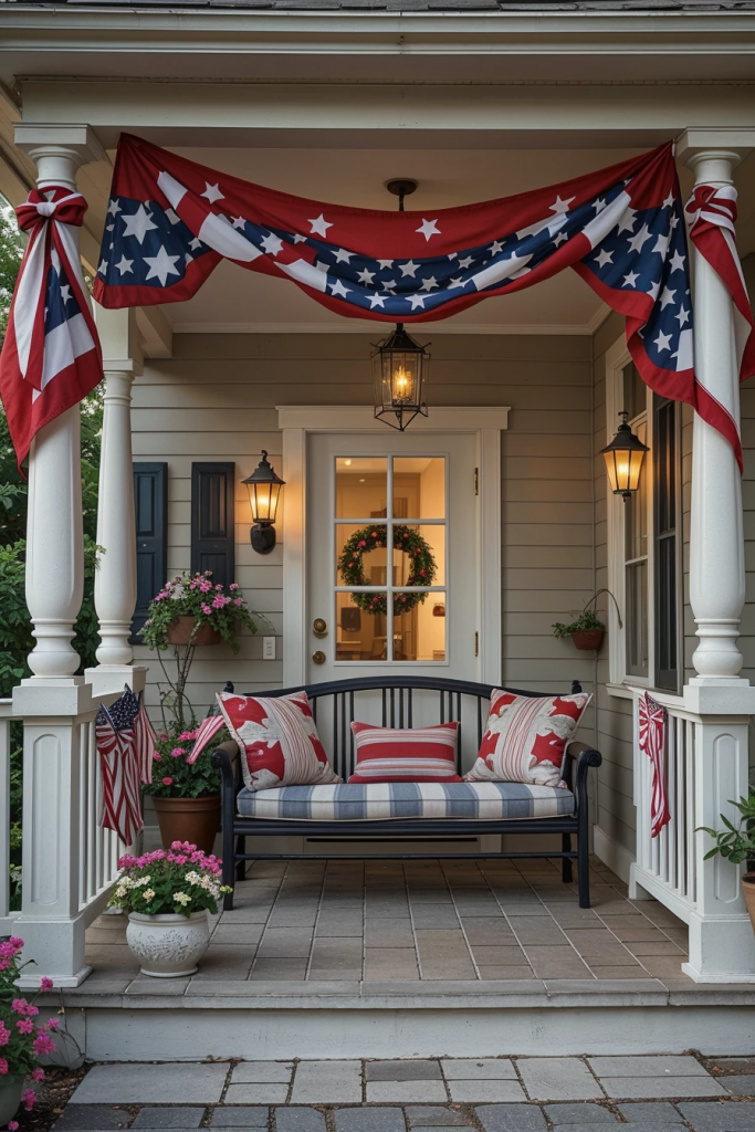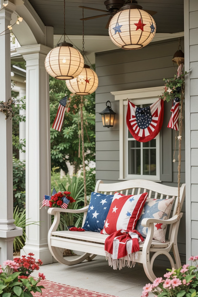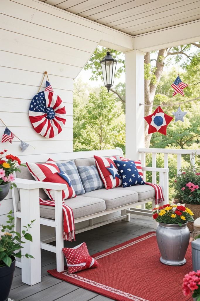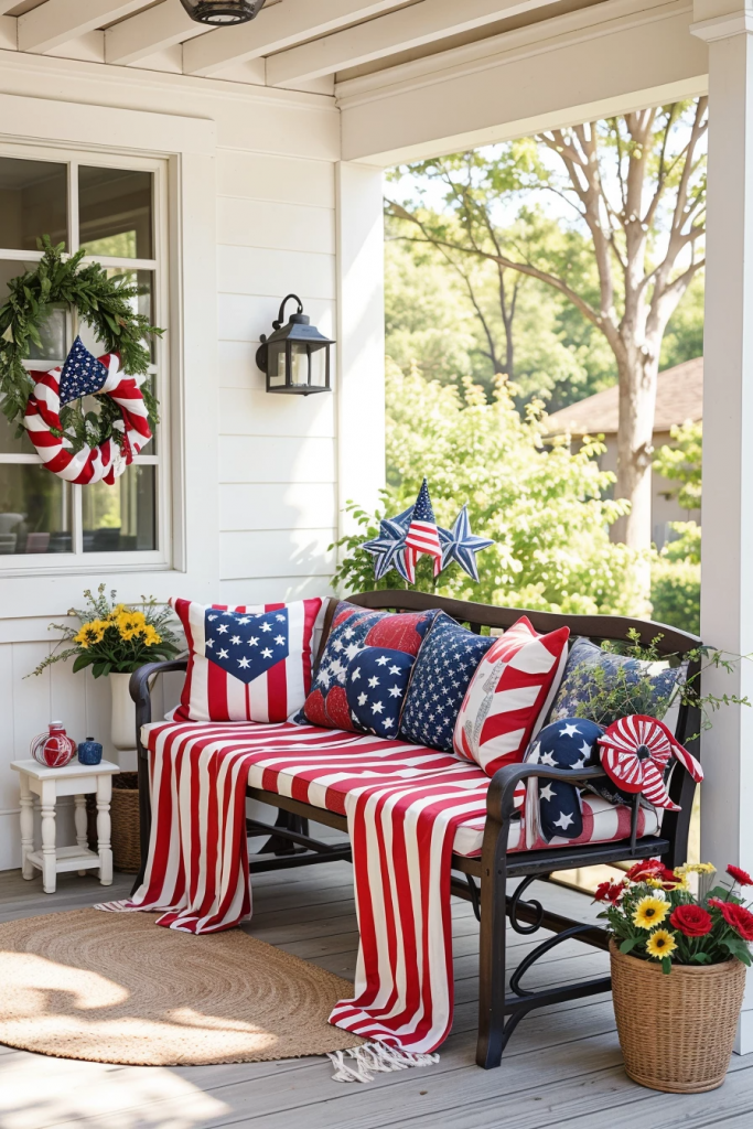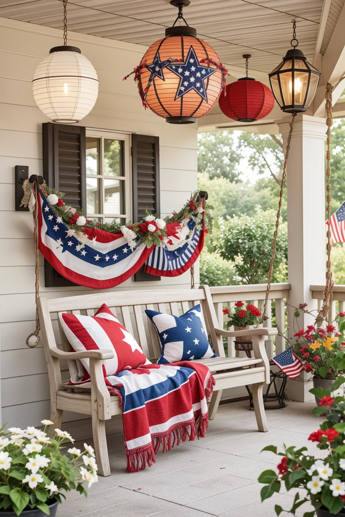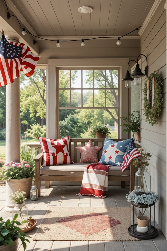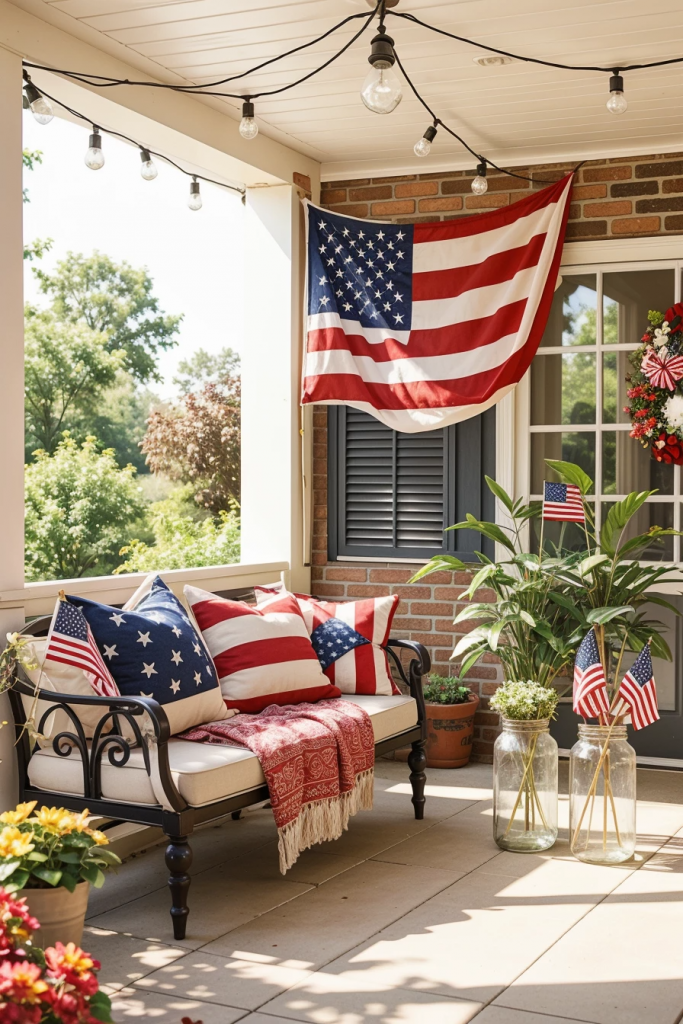 Decorate your porch by turning a corner into a custom cozy nook which is patriotic using layered cushions, small seating, and your personal touches. Surround a cushioned bench with small items like vintage jars full of flags or candles and books. For additional warmth, add string lights over the area. This design can also be used on smaller porches or as a reading area with holiday magic.
