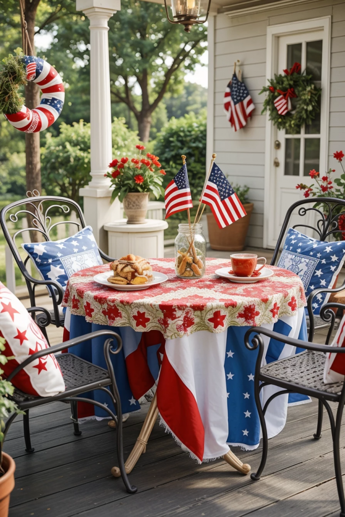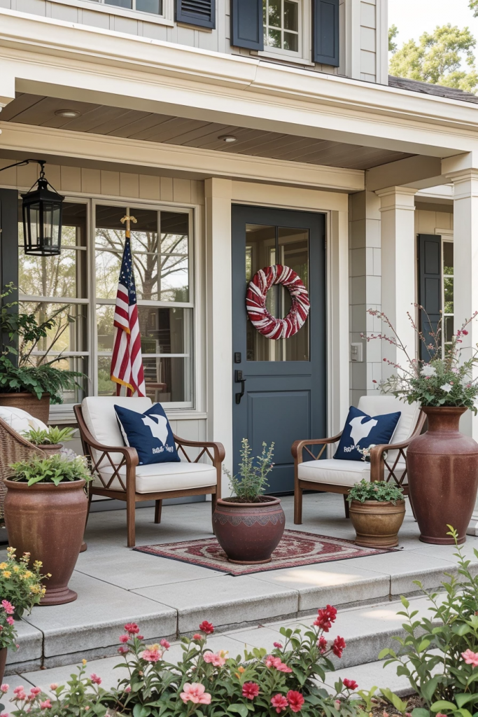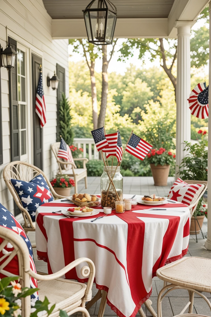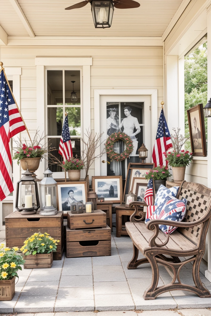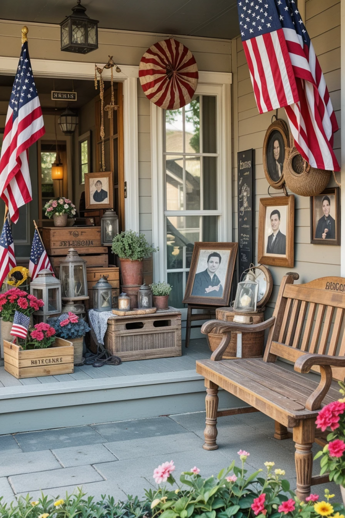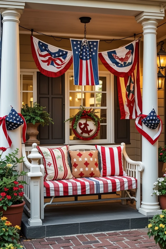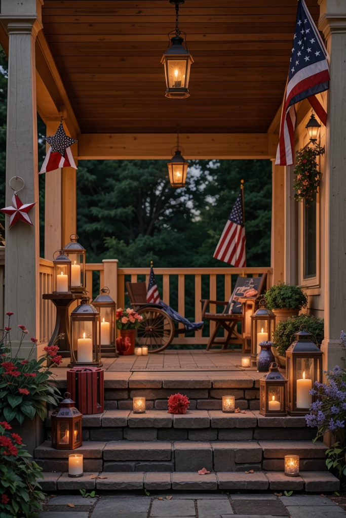 Decorate your porch by turning a corner into a custom cozy nook which is patriotic using layered cushions, small seating, and your personal touches. Surround a cushioned bench with small items like vintage jars full of flags or candles and books. For additional warmth, add string lights over the area. This design can also be used on smaller porches or as a reading area with holiday magic.