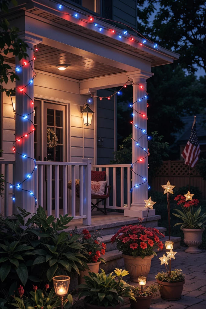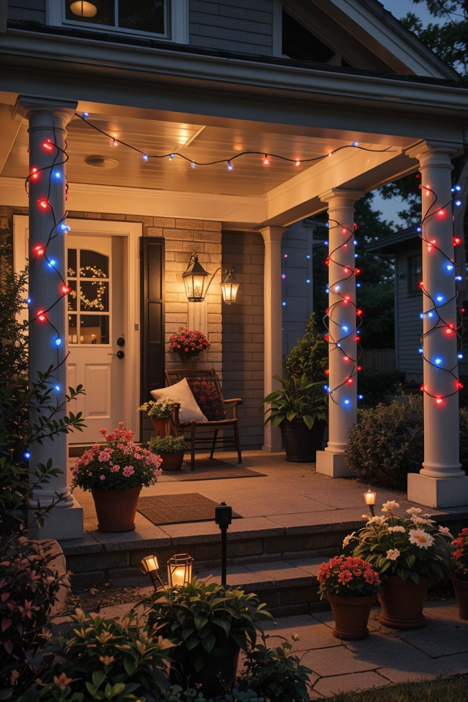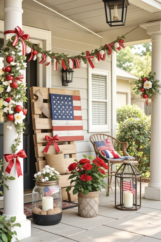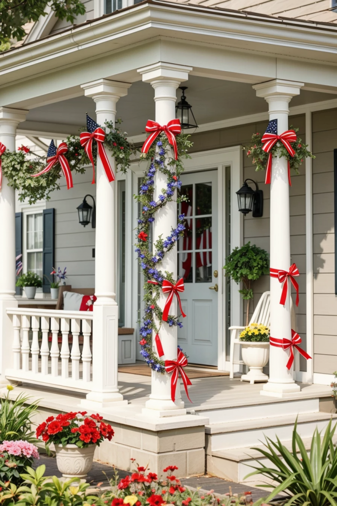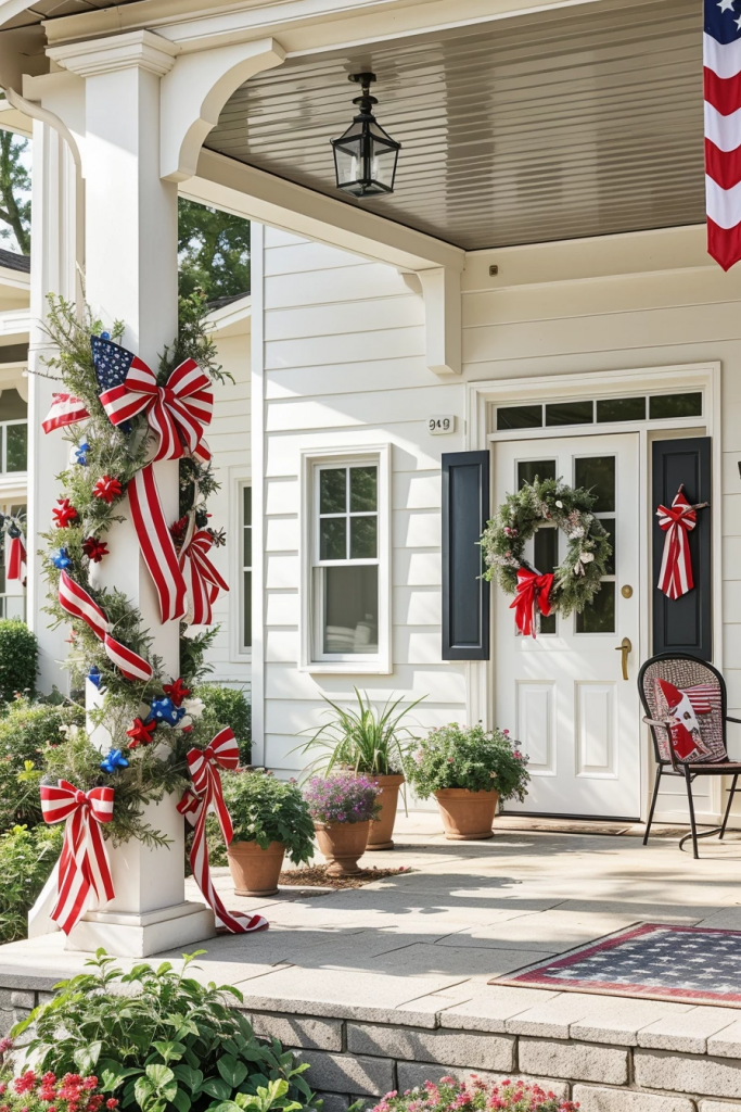 For a bold vertical look, decorate your porch columns with garlands showcasing stars and stripes. Whether they’re made of tinsel, fabric, or wood, star shapes add so much depth. For additional visual interest, add lights or ribbons. This is ideal for tiny porches as well as big verandas because of its versatility.