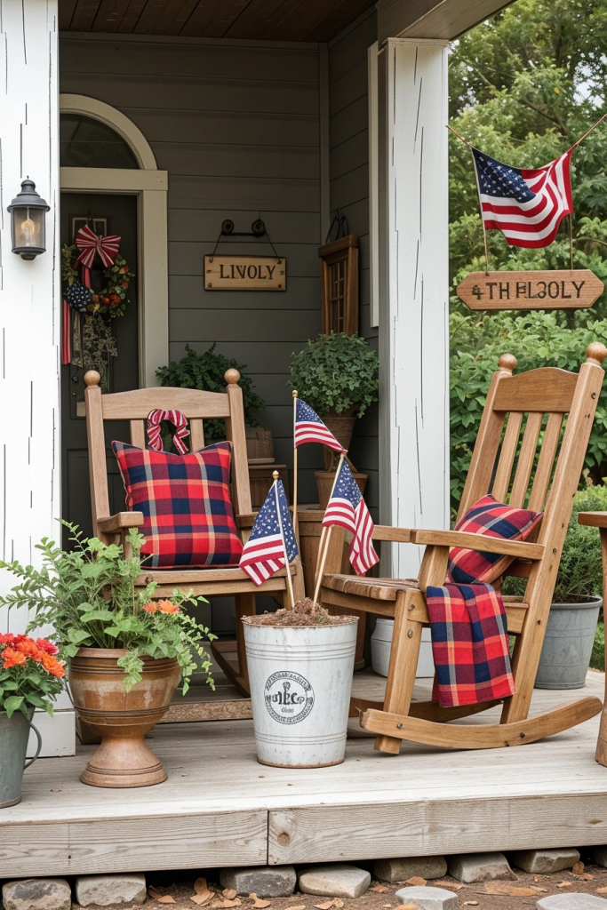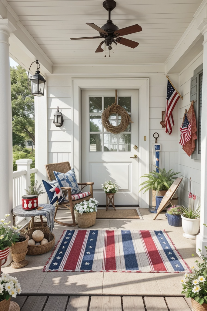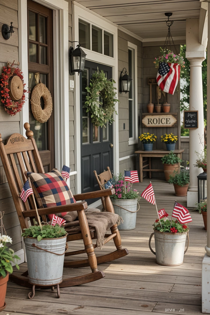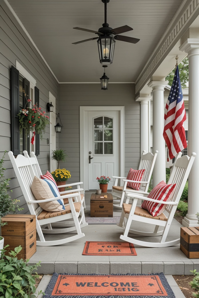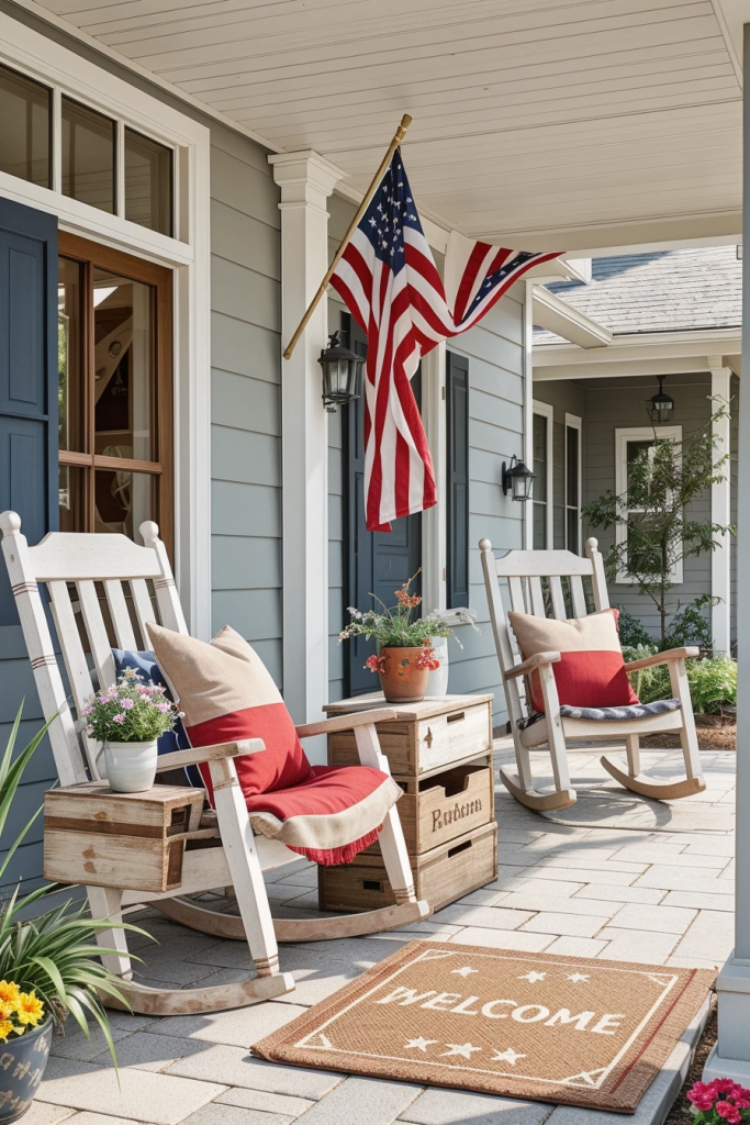 To celebrate the 4th of July, red, white, and blue decorations are essential; this includes American flags and rustic wooden crates. Additionally, rocking chairs serve as stylish statement pieces and a vintage welcome mat rounds everything off. This design is timeless and pleasing to the eye, making it perfect for those looking for all-American charm.