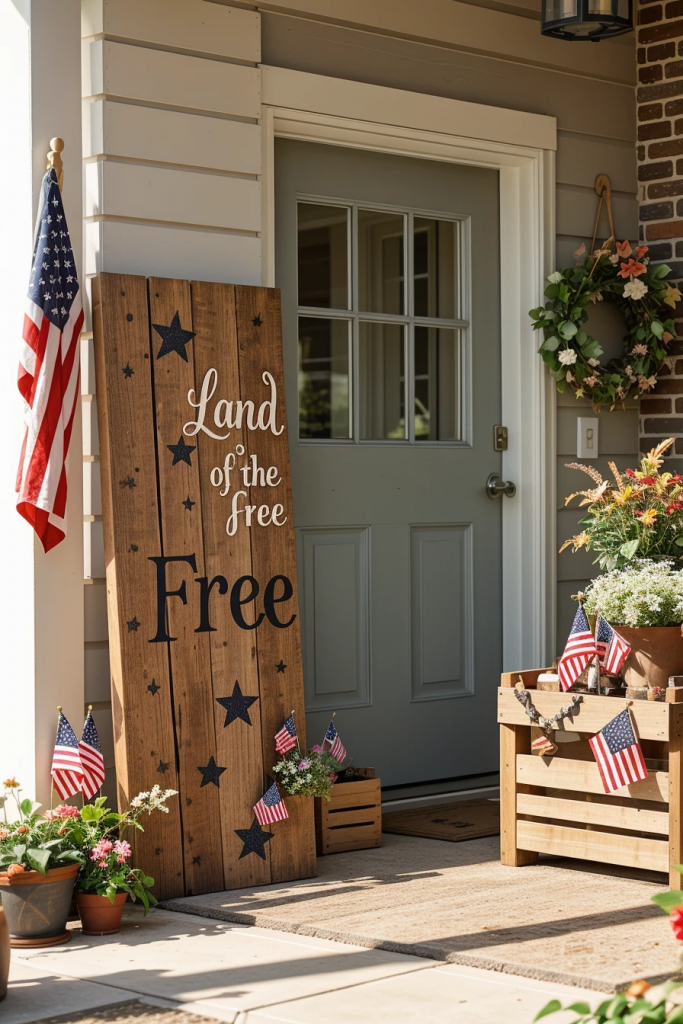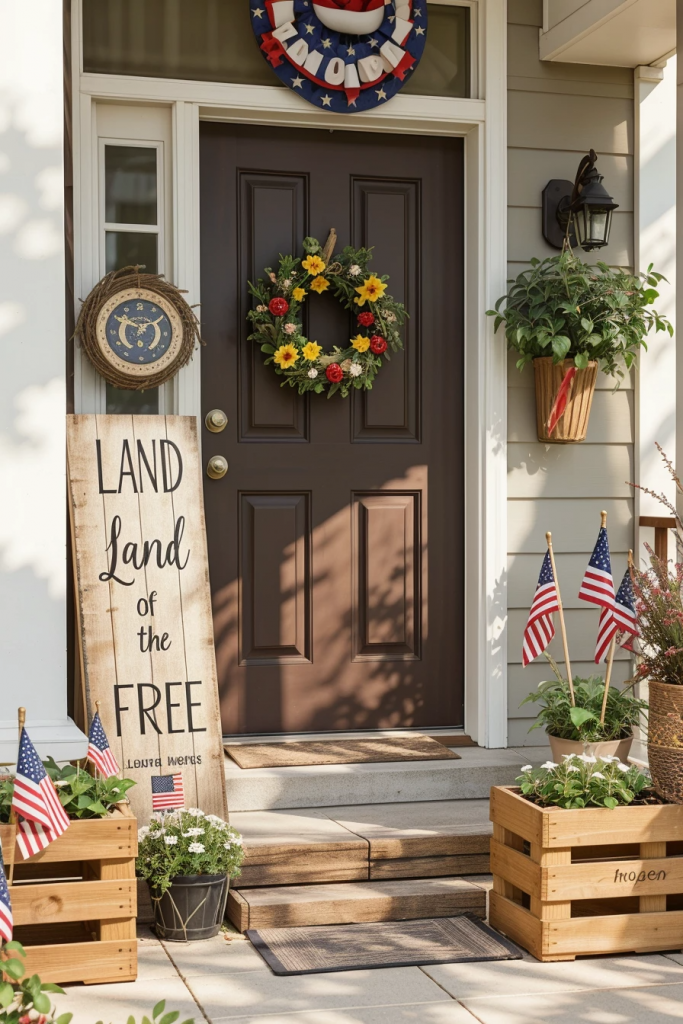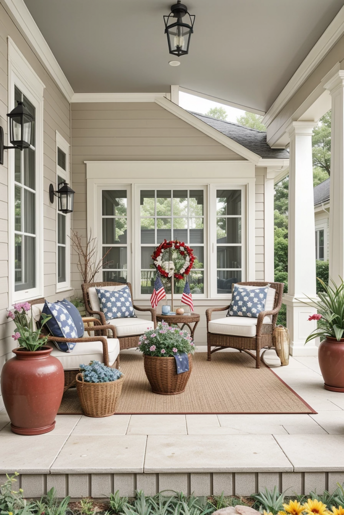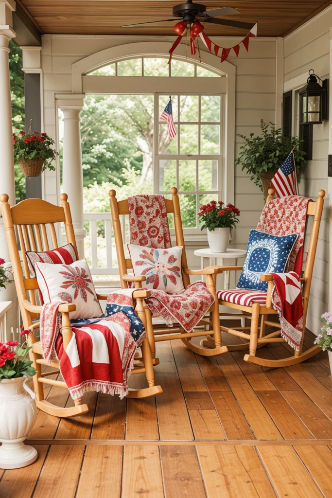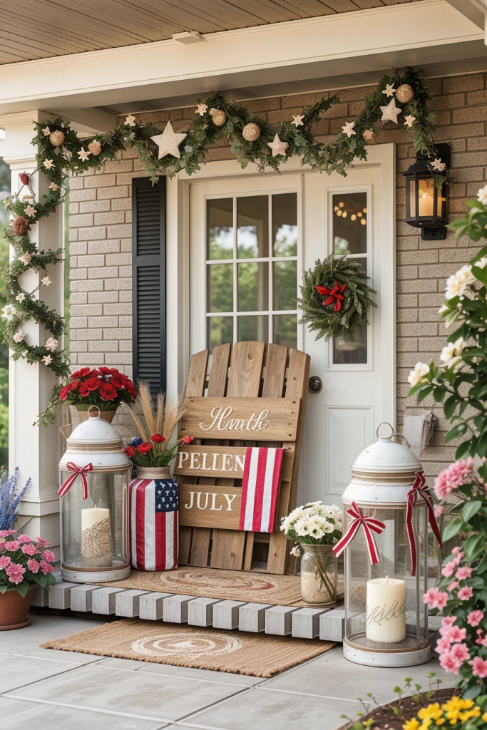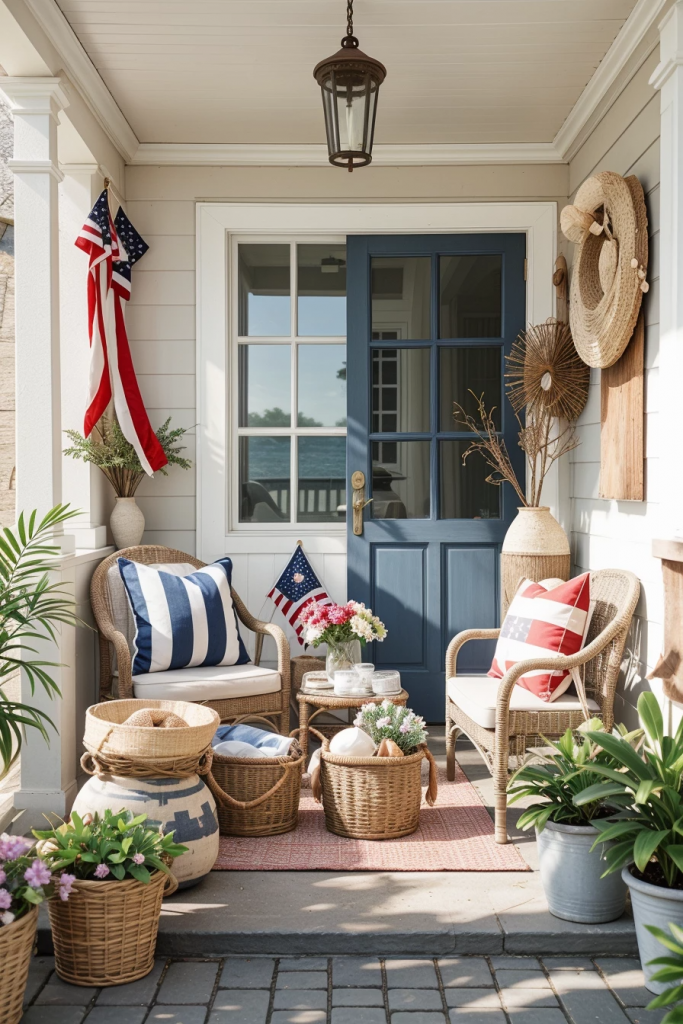 To celebrate the 4th of July, red, white, and blue decorations are essential; this includes American flags and rustic wooden crates. Additionally, rocking chairs serve as stylish statement pieces and a vintage welcome mat rounds everything off. This design is timeless and pleasing to the eye, making it perfect for those looking for all-American charm.