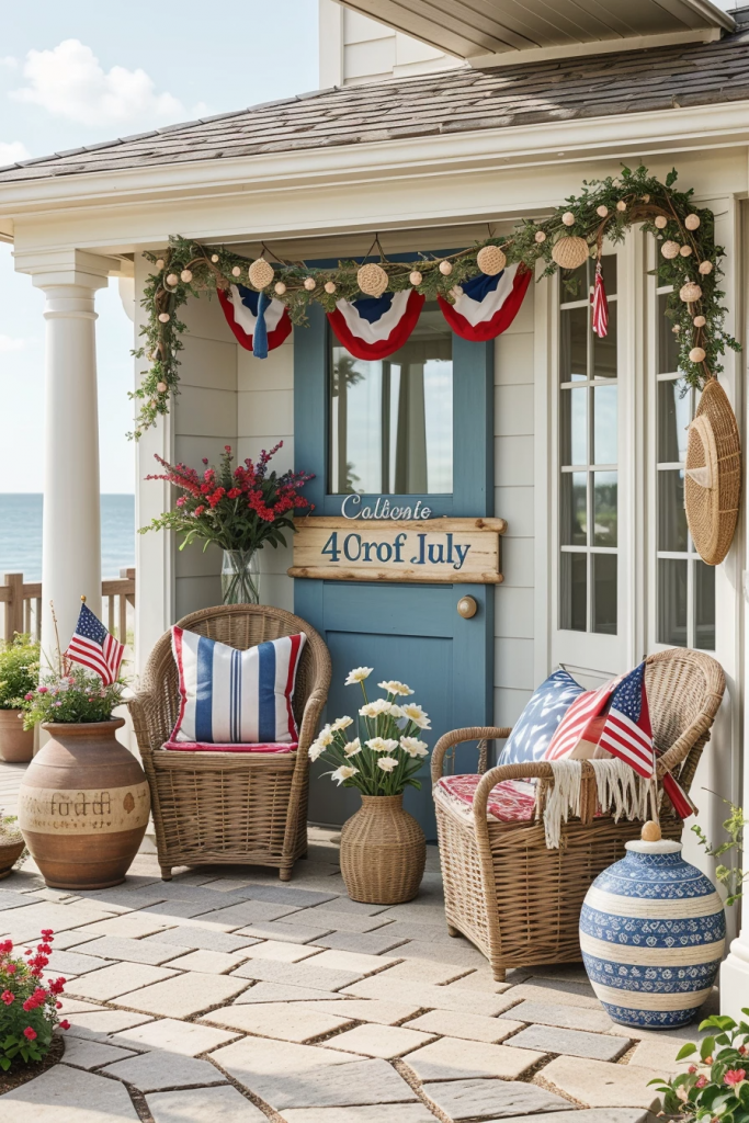 Combine coastal and patriotic colors like red, white, and blue with anchors, ropes, driftwood, and seashells. Striped outdoor rugs, linen cushions, and vintage buoy-like accessories complete the look. This style suits beachside homes or anyone who wants a casual, breezy take on Independence Day.