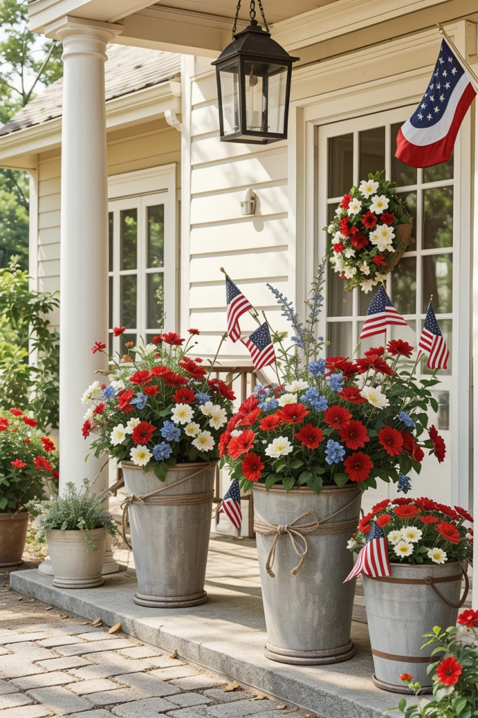 Container gardens bursting with red geraniums, white daisies, and blue salvia offer enhanced 4th of July porch decor. Add an extra farmhouse touch with vintage buckets or urns. For a finishing touch, wrap the pot with burlap ribbon emblazoned with mini flags. This design fusion of natural beauty and patriotism complements homes of any size.