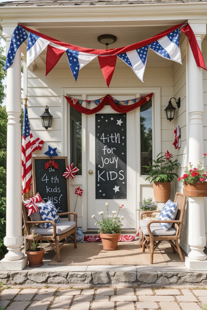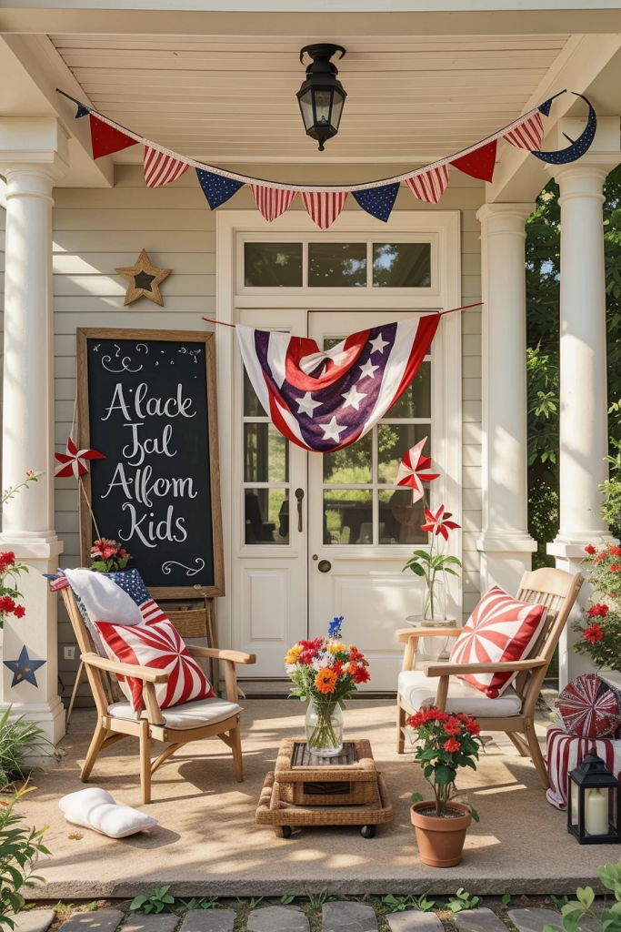 Transform your porch into a fun and engaging area for children with themed chalkboards, low-placed flag bunting, bright pinwheels, and soft pillows to brighten up the place. Crayons, themed books, or even small snacks can be offered in festive containers on the small table. The playful designs and nice colors will surely add to the joyful spirit for families celebrating together.
