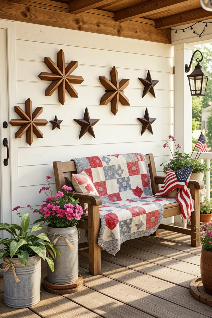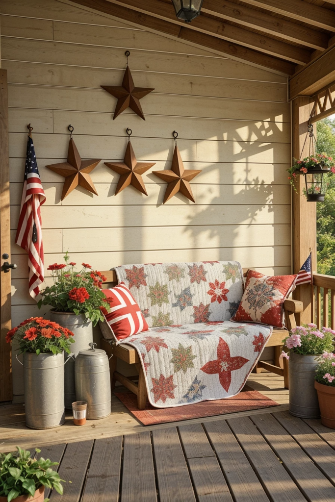 Americana decor is perfect for farmhouse styled porches, merging country pride with farmhouse aesthetics. Use old signage, barn stars, and patchwork quilts with galvanized planters overflowing with seasonal flowers. Place wooden benches or rocking chairs with gingham cushions on the porch. The entire setup pays tribute to the patriotic color scheme in a rustic manner and still honors what it means to give warm nostalgic vibes.