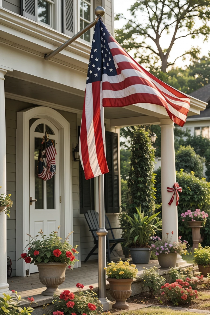 For unmissable and bold presentation of the American flag, securely place a flag pole mount on your porch. To match with other hardware, use a bronze or nickel mount, and ensure visibility is clear. To enhance visual appeal, surround the bottom with elegant flower pots or lanterns. This is a tidy yet deeply respectful show of patriotism.