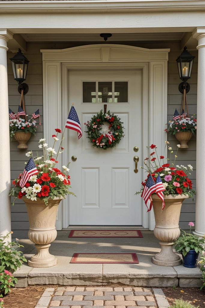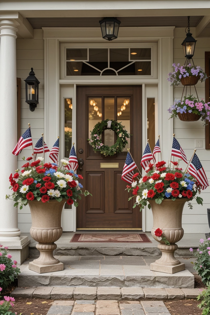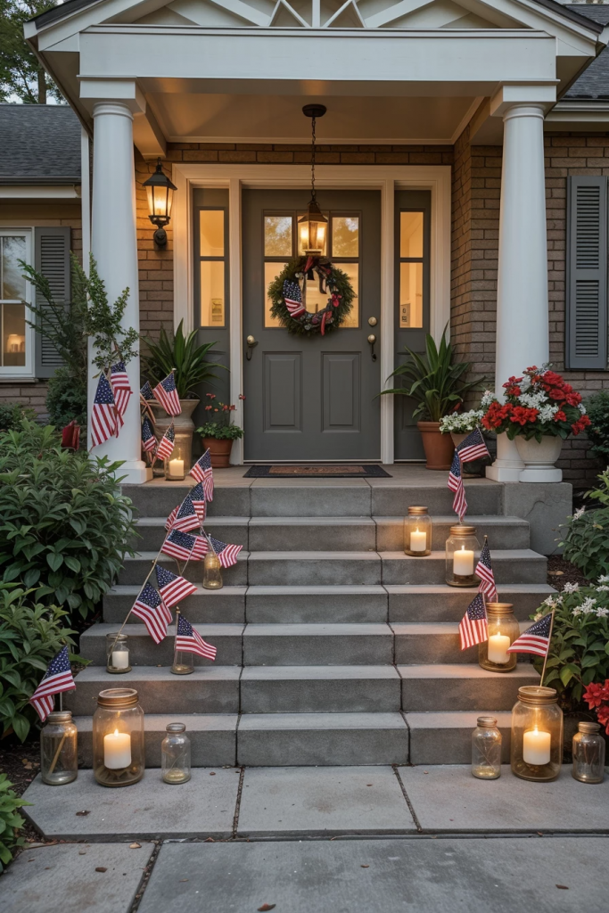 For a simple and beautiful entrance, place small American flags around your porch steps. You can place them in flower pots, between the stair railings, or right into the steps’ edges with foam bases. Add small lanterns or mason jars filled with unlit sparklers for charm. Using this approach adds height without overwhelming the aesthetic.