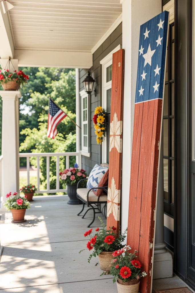 Make whimsical hand-painted porch signs out of reclaimed wood with stripes or quotes like “Freedom” or “USA.” Rather than placing the signs upright, lean them against porch columns, railings, or large planters for vertical interest. This adds a patriotic touch while evoking rustic aesthetics. Rotational finishes of red, white, and blue, coupled with a DIY touch evokes a unique flair to front porch decor.