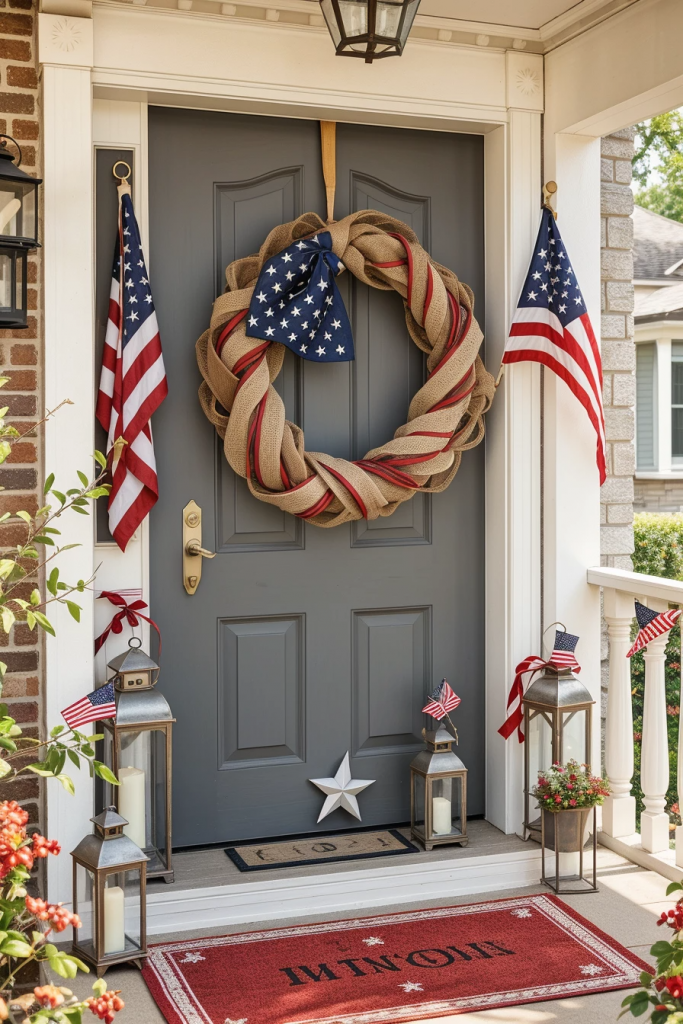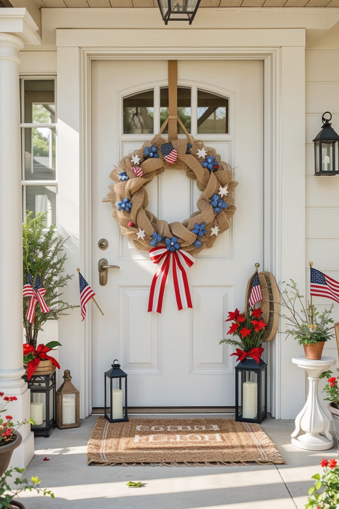 Placing an American flag wreath on a front porch will make its entrance truly spectacular. Use denim, burlap, or ribbon, and arrange them in either starburst or floral patterns. To enhance the entrance, combine the wreath with a door mat or lanterns. This single statement piece will effortlessly beautify the whole porch.