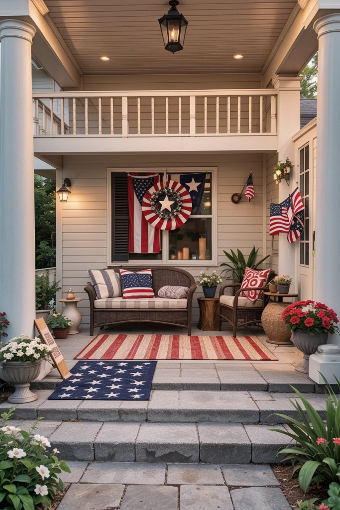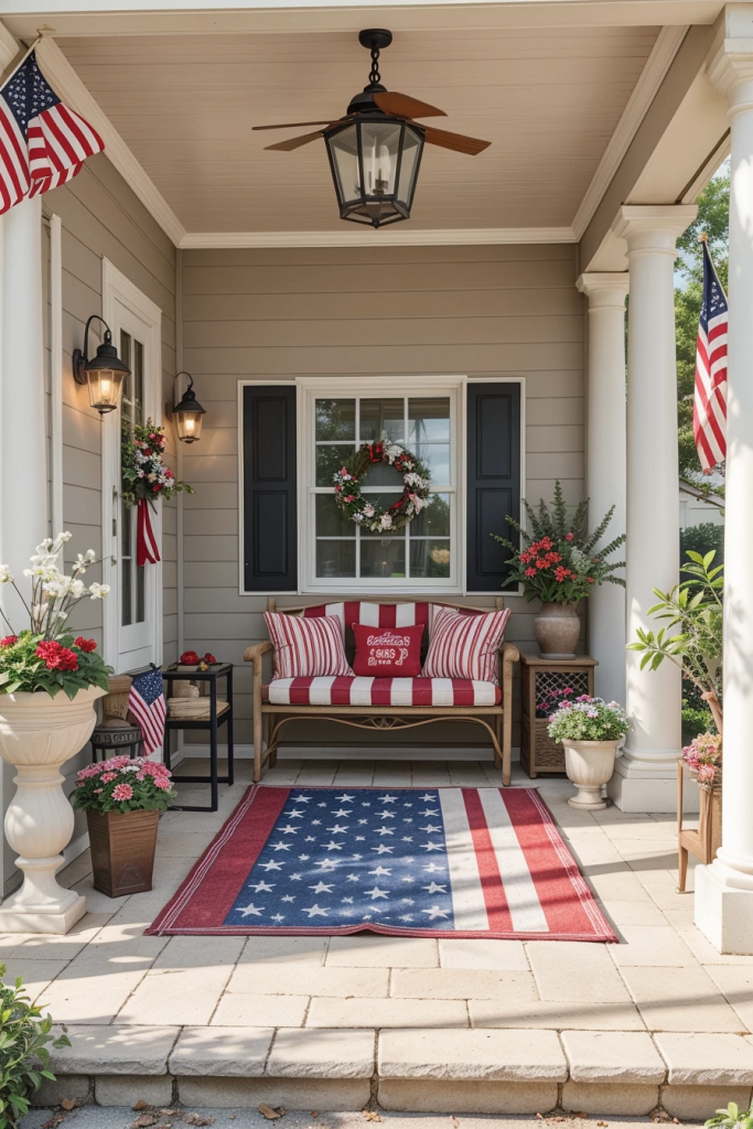 Elevate your front porch with a decor rug or runner that fits your theme. A bold stars and stripes design will coordinate seamlessly with your seating and decor. Pick outdoor-grade materials in softer distressed neutrals for a subdued look, or go bright for more energetic vibes. Rugs single-handedly create a patriotic space and are very easy to work with. It adds comfort beneath your feet.