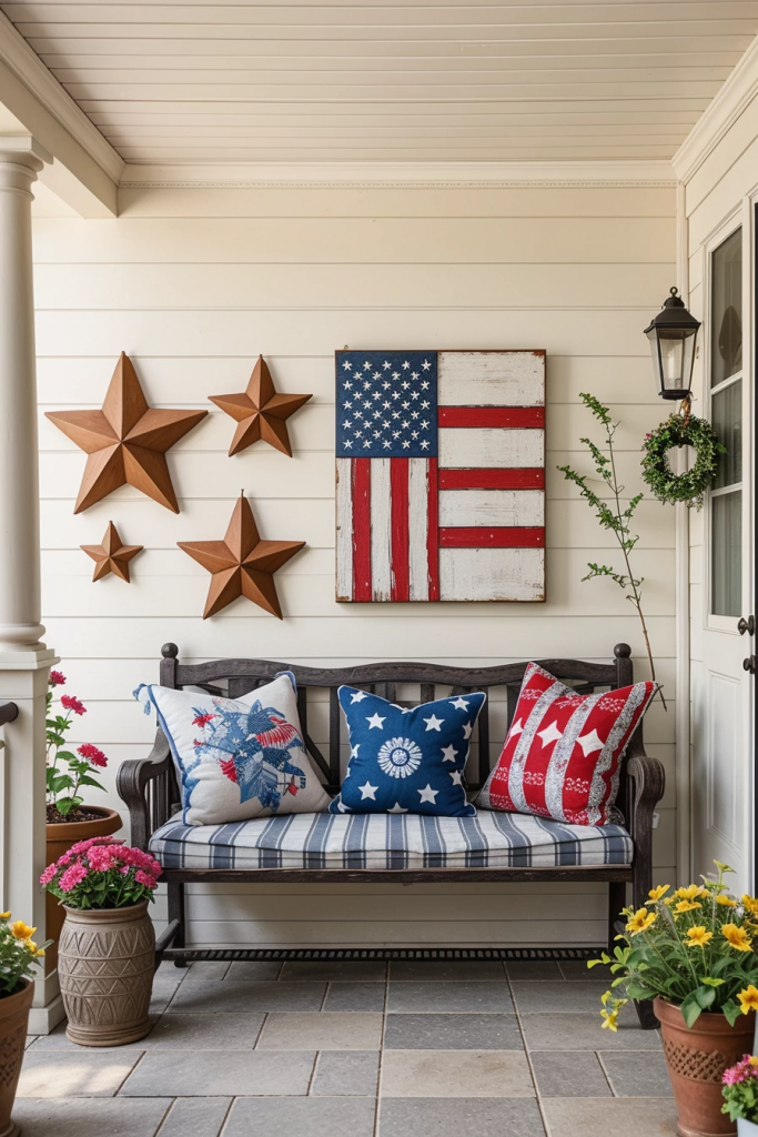 Give your front porch amazing vertical life by including patriotic wall decor, such as wooden stars, metal flag plaques, or canvas banner hangings. You can place the items in clusters or space them out for a more tidy appearance. Coordinate the colors with the cushions, or rugs to create a primary theme. This decoration option adds height and more flair to a space without using precious floor space.