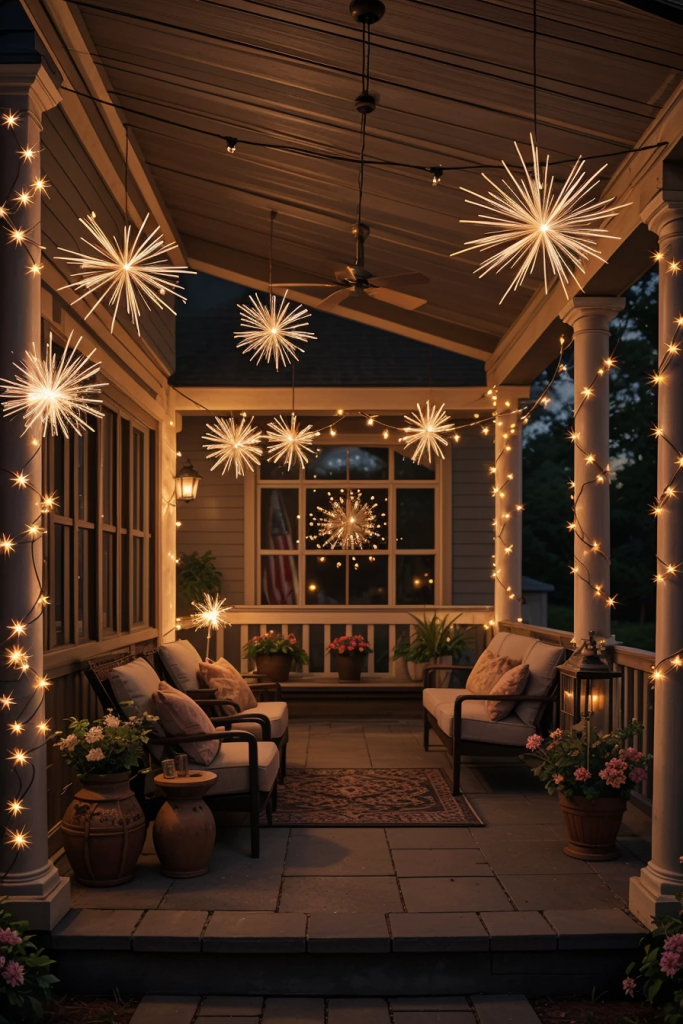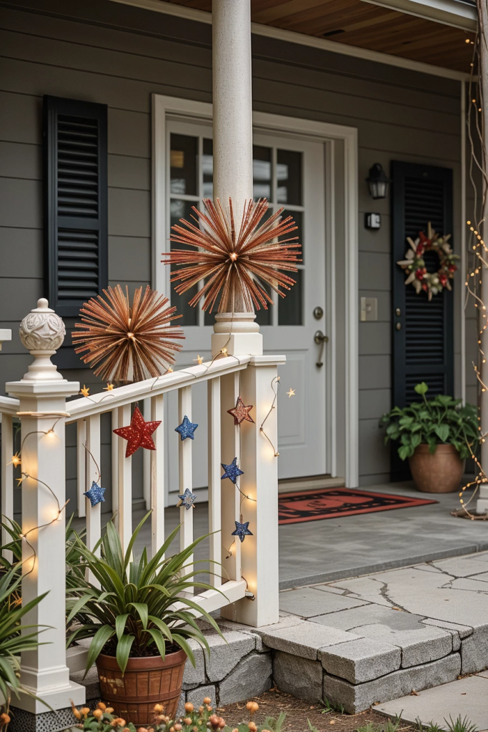 Make or buy fireworks themed decorations and cutouts to mount on the sides of your porch for a more lively and captivating look. These can be crafted from either wood, corrugated metal or even waterproof foam, arranged in groups to imitate an exploding display. Wrap them in twinkle lights or add star decals to polish the look. It is a creative way to add a playful spirit without the use of fireworks.