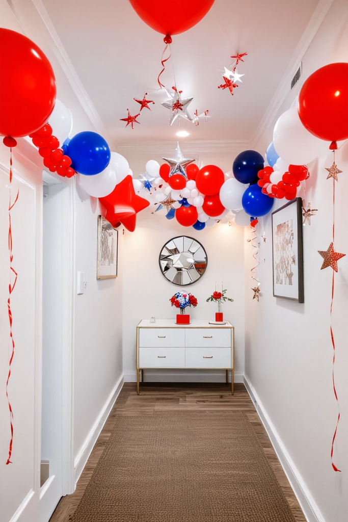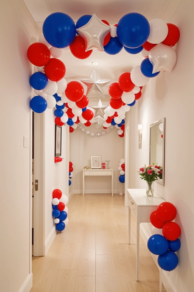 The space is instantly infused with energy through the red, white, and blue balloon garlands. Their placement should be at the top corners of the hallway or at entry junctions. In addition, you can pair them with mini flags or metallic star balloons. Surrounding decor, which includes a white console table with minimal art can be Helenistic so the gKa the balloons shine without overwhelming the area. Ideal for parties or casual celebratory vibes.