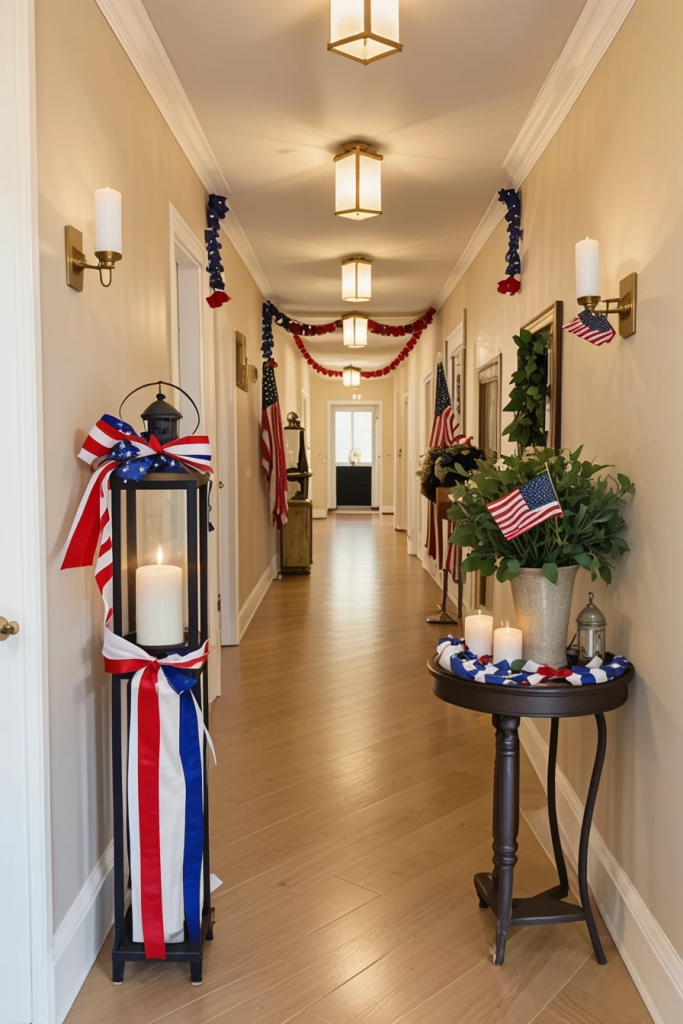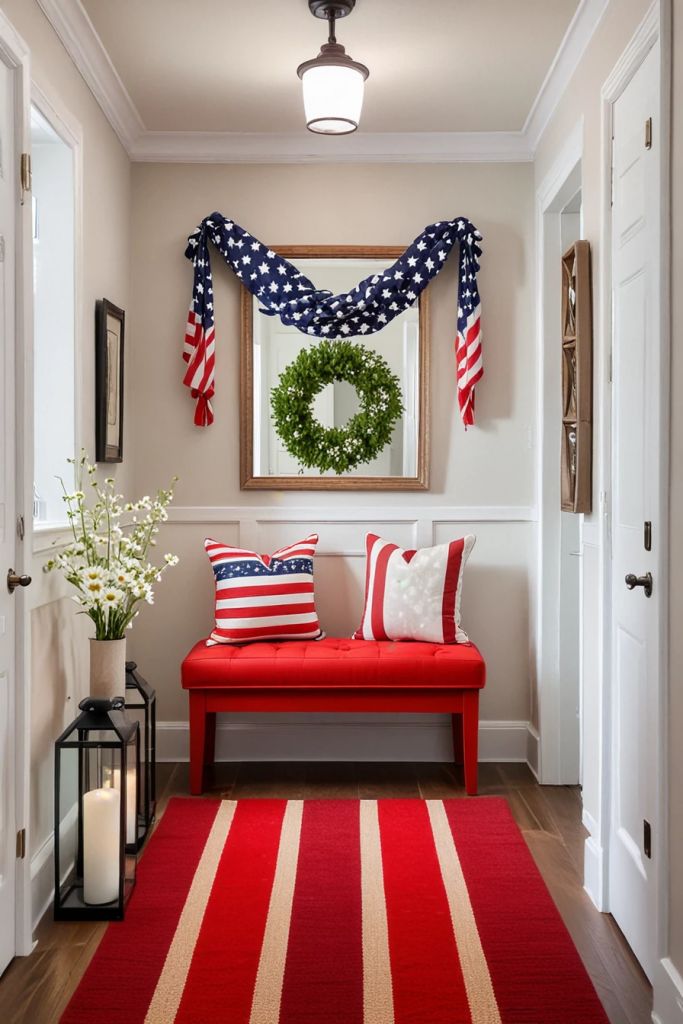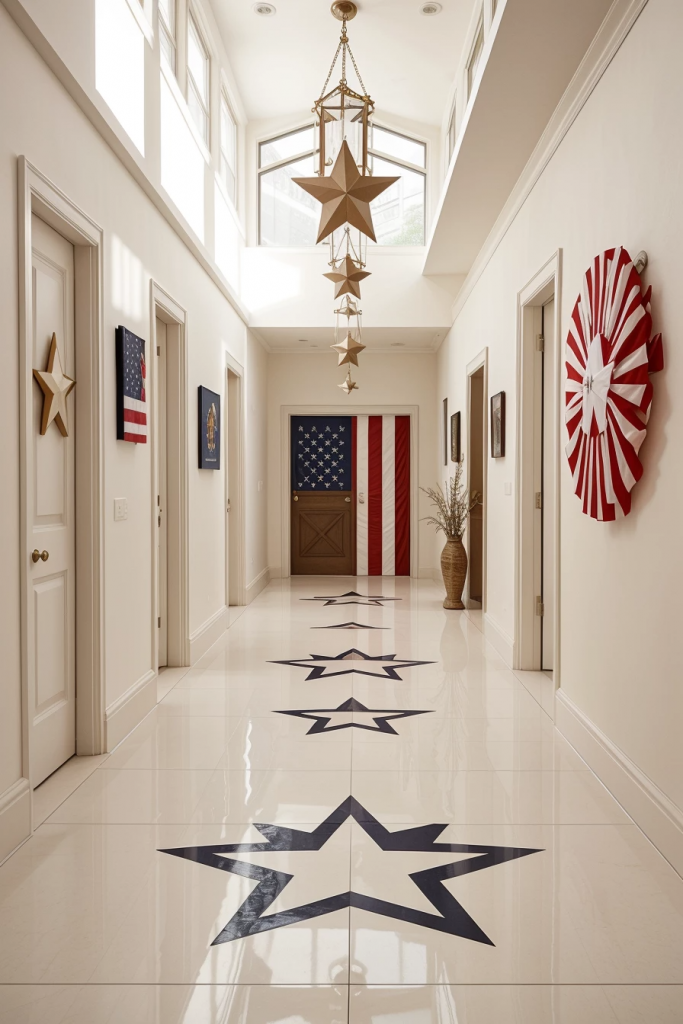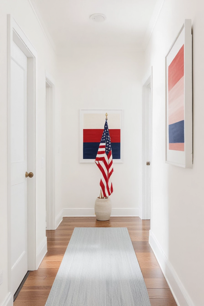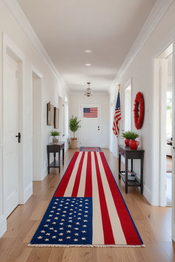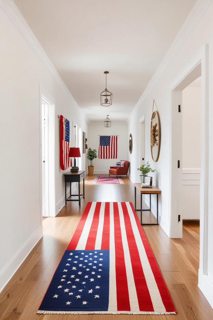 As mentioned earlier, placing an area runner rug with bold stripes of red, white, and blue instantly adds patriotic flair. The themed rug helps anchor the hallway decor while bringing together the entire space, regardless if you choose a faded vintage look or a more modern design. This works well with white walls alongside minimalistic furniture, complemented by accent hanging flags or star garlands to achieve balance. Overall, this approach helps add texture while keeping the aesthetic purposeful and festive.