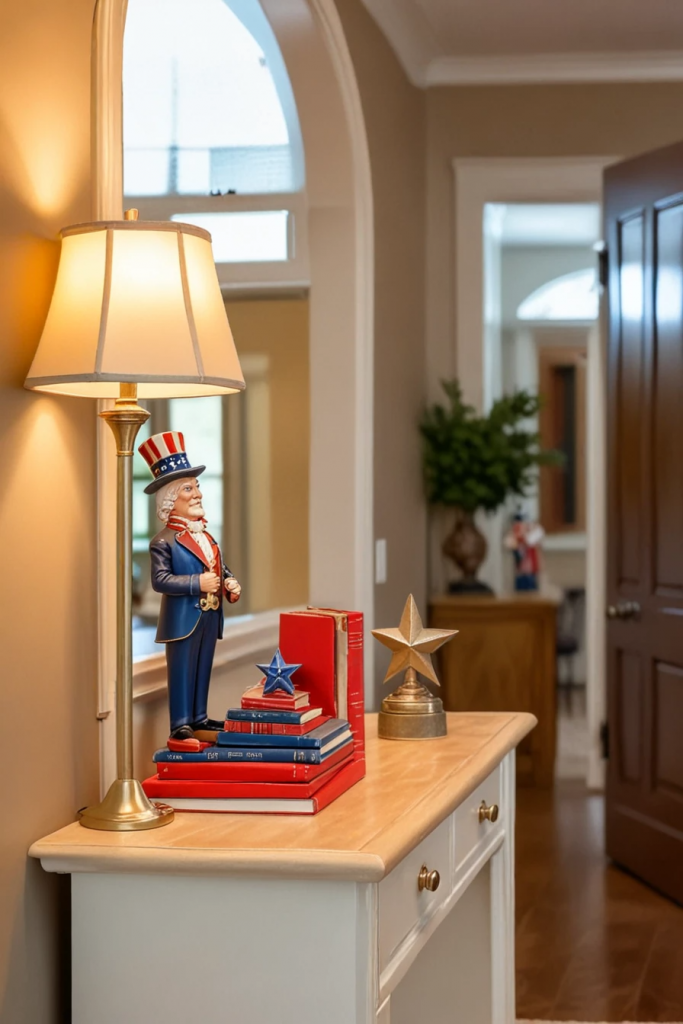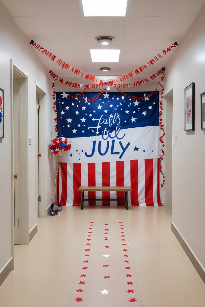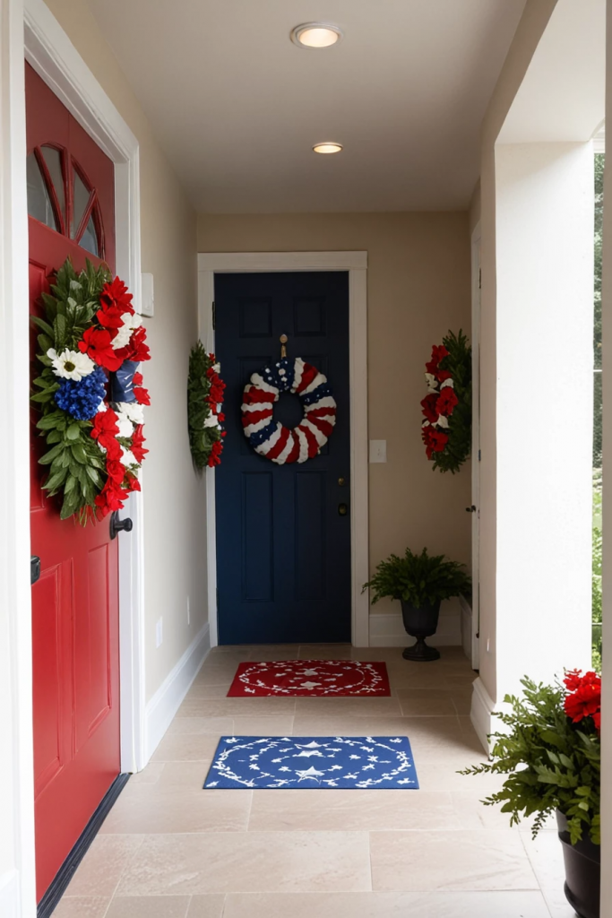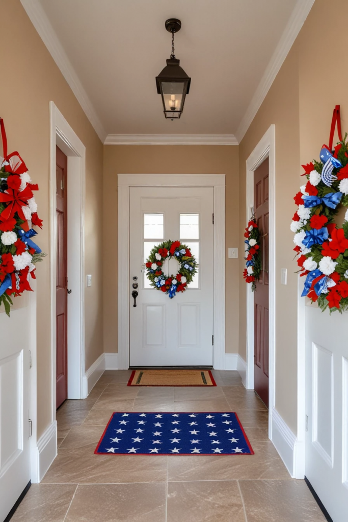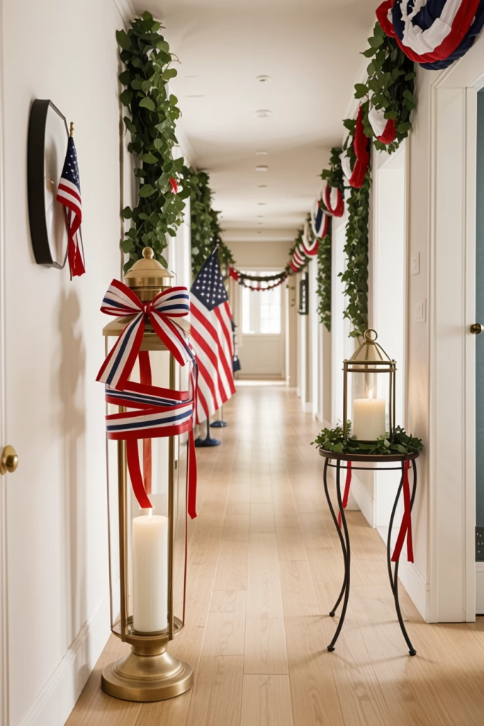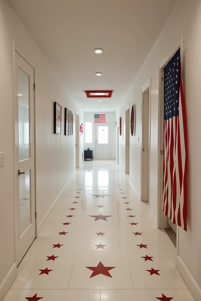 As mentioned earlier, placing an area runner rug with bold stripes of red, white, and blue instantly adds patriotic flair. The themed rug helps anchor the hallway decor while bringing together the entire space, regardless if you choose a faded vintage look or a more modern design. This works well with white walls alongside minimalistic furniture, complemented by accent hanging flags or star garlands to achieve balance. Overall, this approach helps add texture while keeping the aesthetic purposeful and festive.