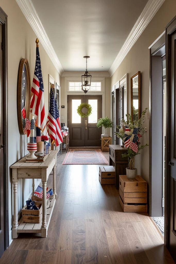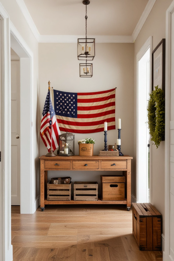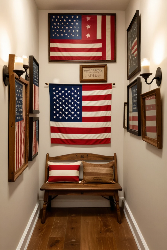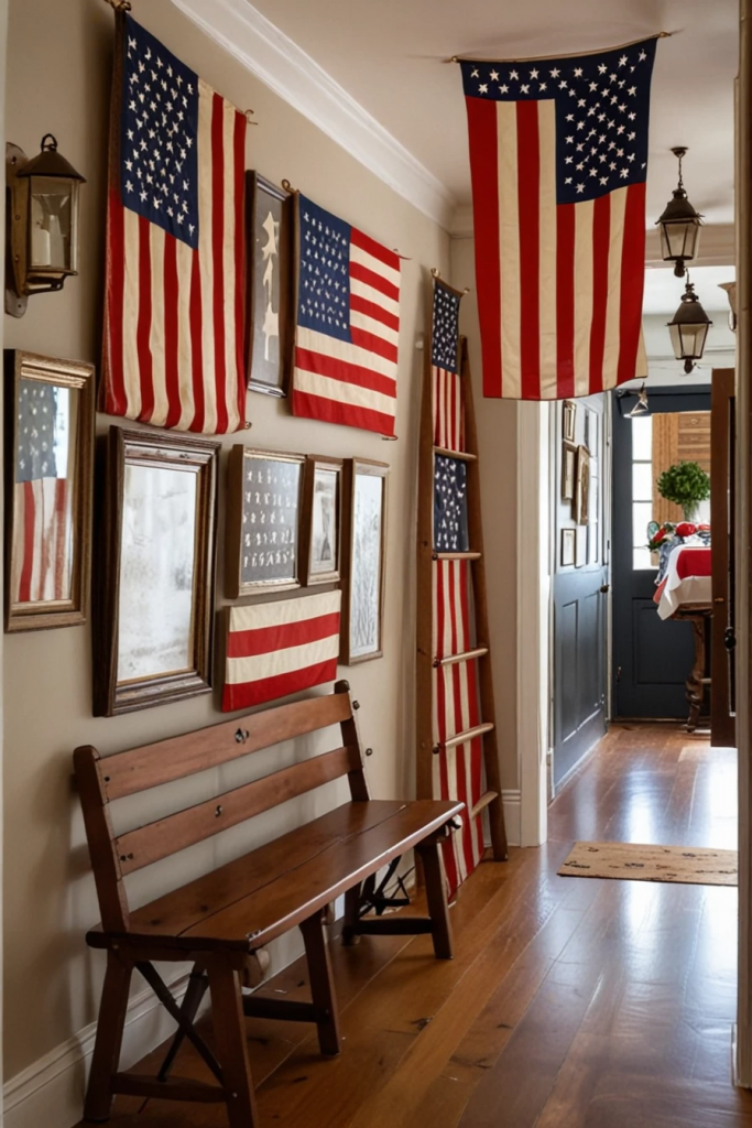 Incorporating vintage American flags strengthens historical ties while also adding charm to your 4th of July setup. You can frame them under glass or elegantly let them cascade over a ladder or rod mounted on the wall. Combine with antique-style sconces, rustic photo frames, or a weathered wood bench placed below. This arrangement displays a collected warmth which increases the dimension of slim or transitional hallways while maintaining a cohesive patriotic theme and warmth.