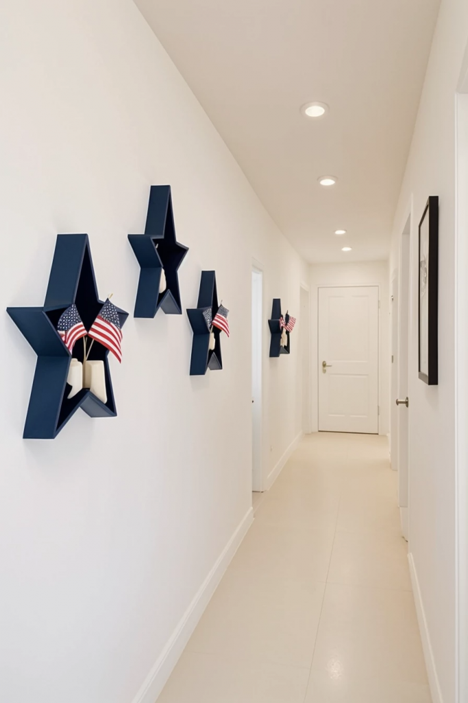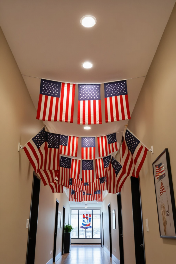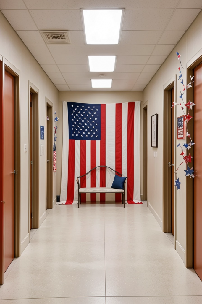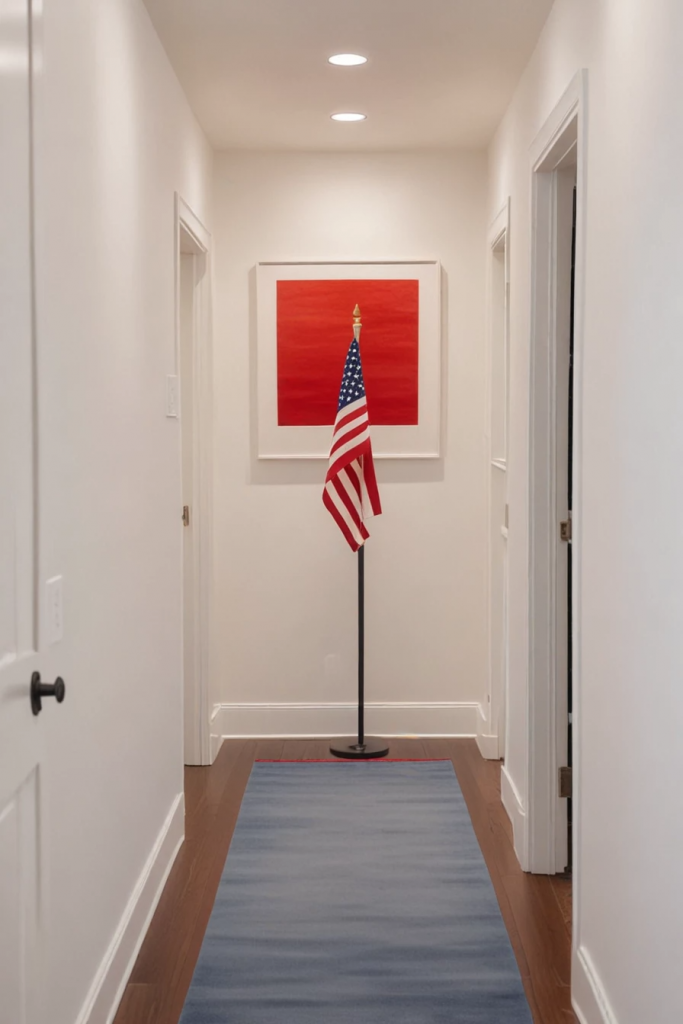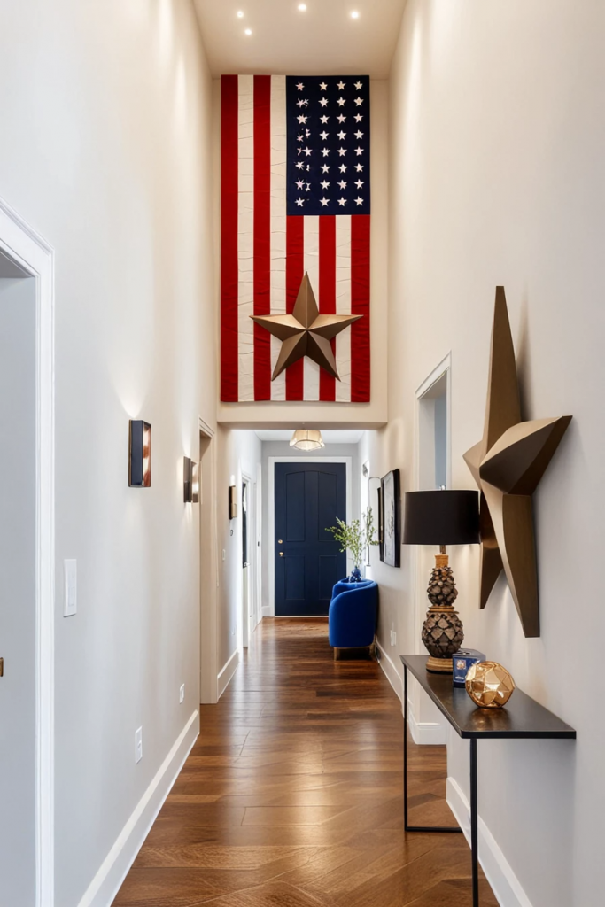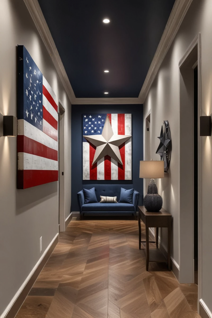 A long corridor can serve as the perfect spot for grand and bold patriotic statement pieces. Depending on your preference, a flag-inspired 3D star sculpture or an oversized flag-inpsired canvas can be the perfect focal point. Strong architectural lighting combined with wall panels in deep colors like blue or charcoal will perfectly frame this display. Such additions undoubtedly turn a simple corridor into a dramatic gold showcase that exudes weight and powerful visuals, transforming it into a jaw-dropping patriotic corridor.