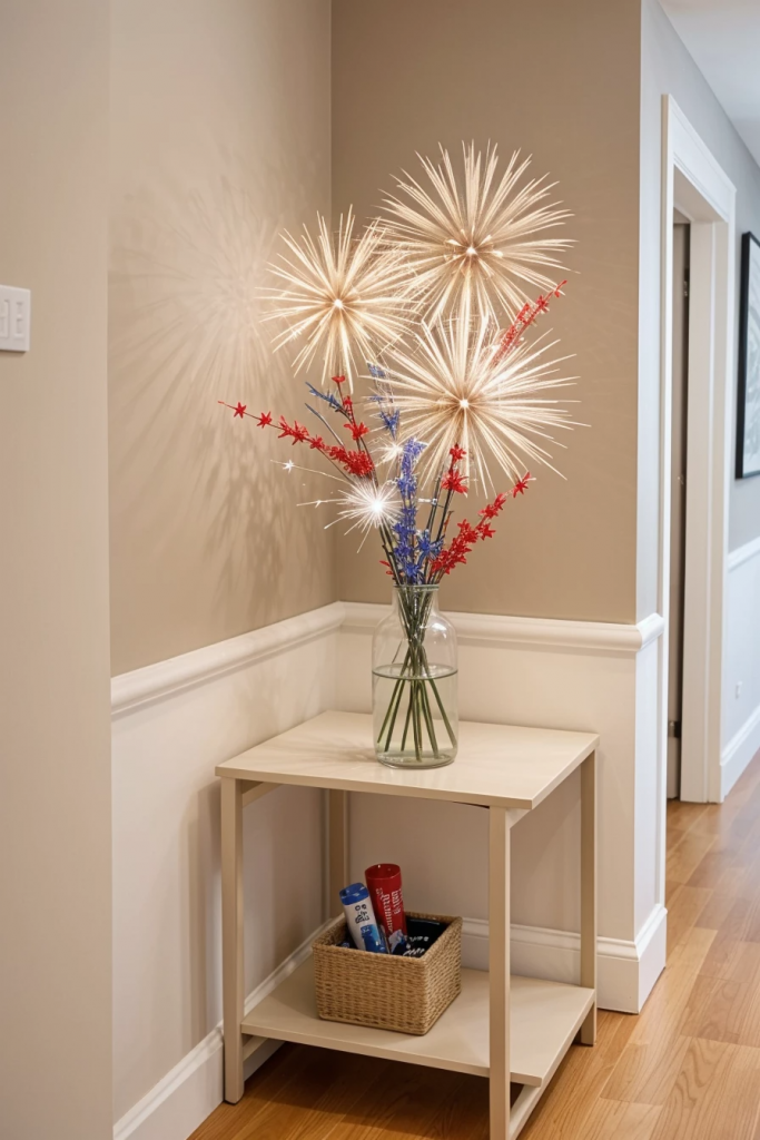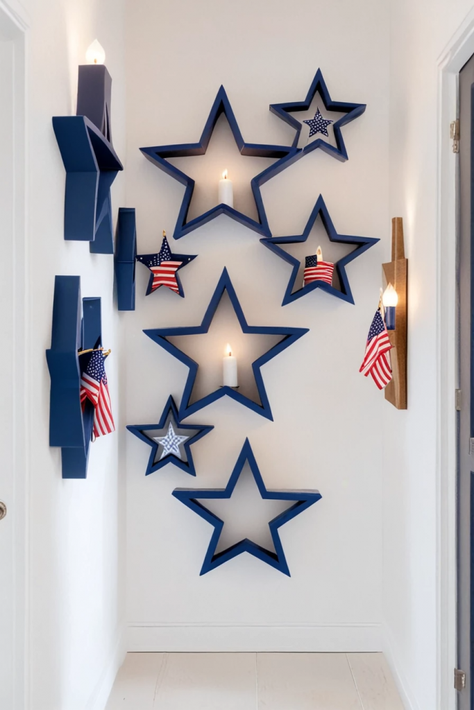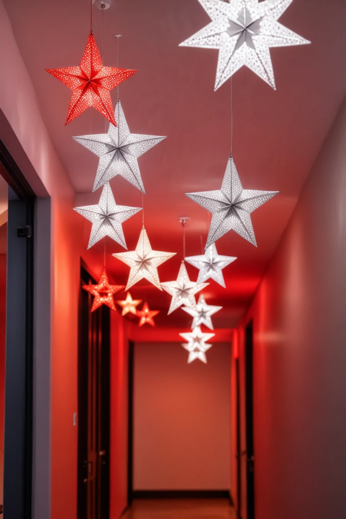 For a dreamy festive effect, hang star decorations with lights in your hallway. Choose paper or plastic. Use LED lights that shine and give off a warm glow. For added depth, hang them at different heights which adds to further decorative intrigue. Placing them in the center or staggering their positions works well too! These accents enhance your July 4th decorations and add a magical charm, especially while lit in the evening.
