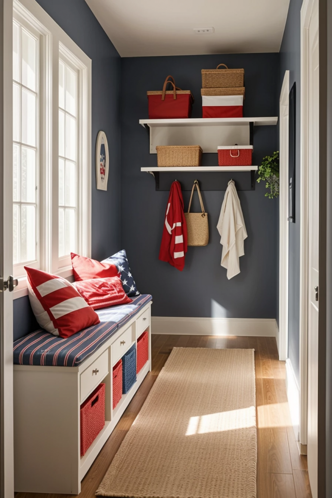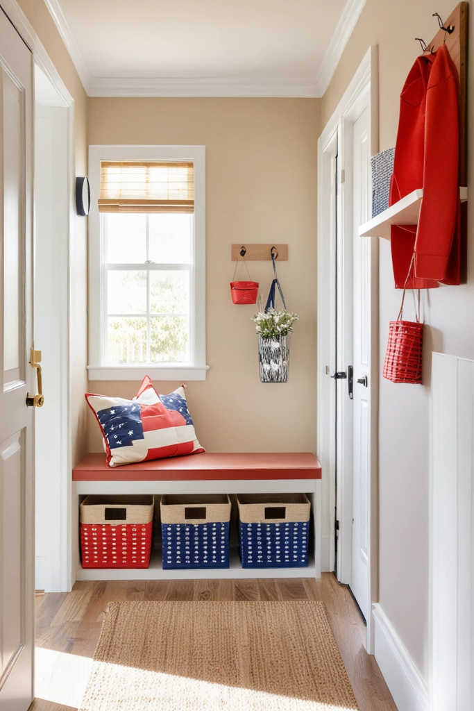 Functionality blends seamlessly with celebration while decorating with red, white, and blue storage baskets. Place the baskets under benches, on a hallway table, or even use them as containers that can be mounted to the wall. This also helps to keep the shoes, keys, and children’s items organized while still using a customizable color scheme. Blend toward woven textures or canvas materials in themed colors as patriotic hues which combine form to function, especially in small hallways where space organization is crucial.