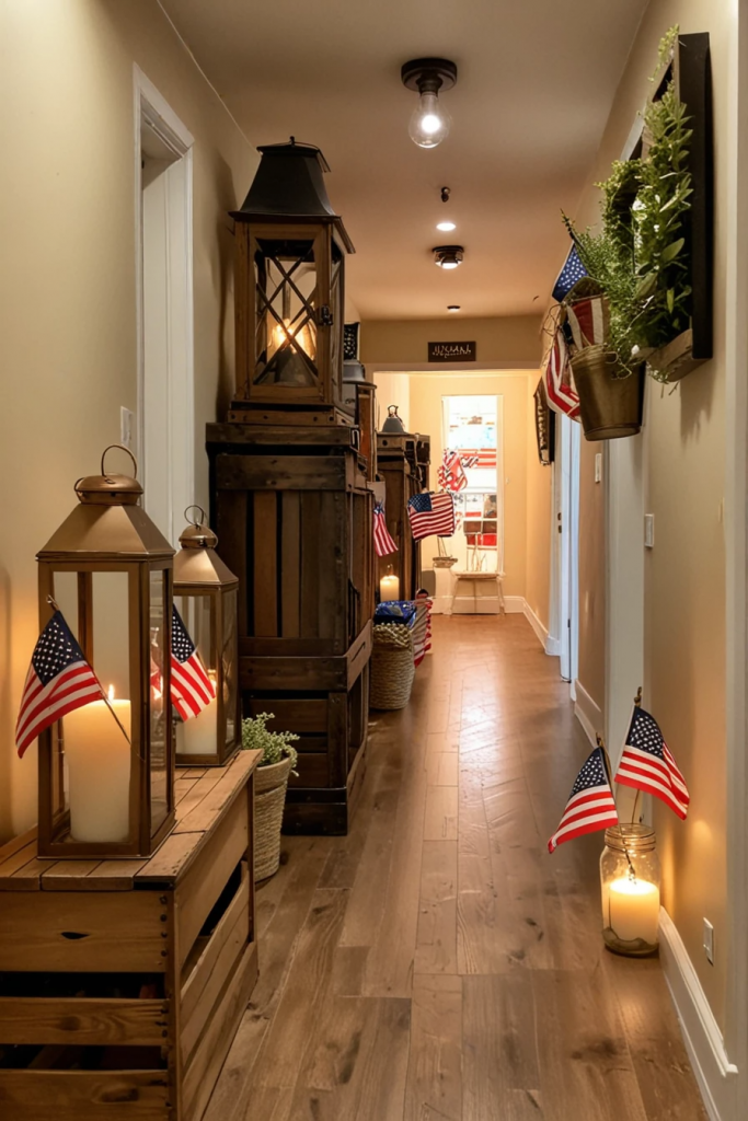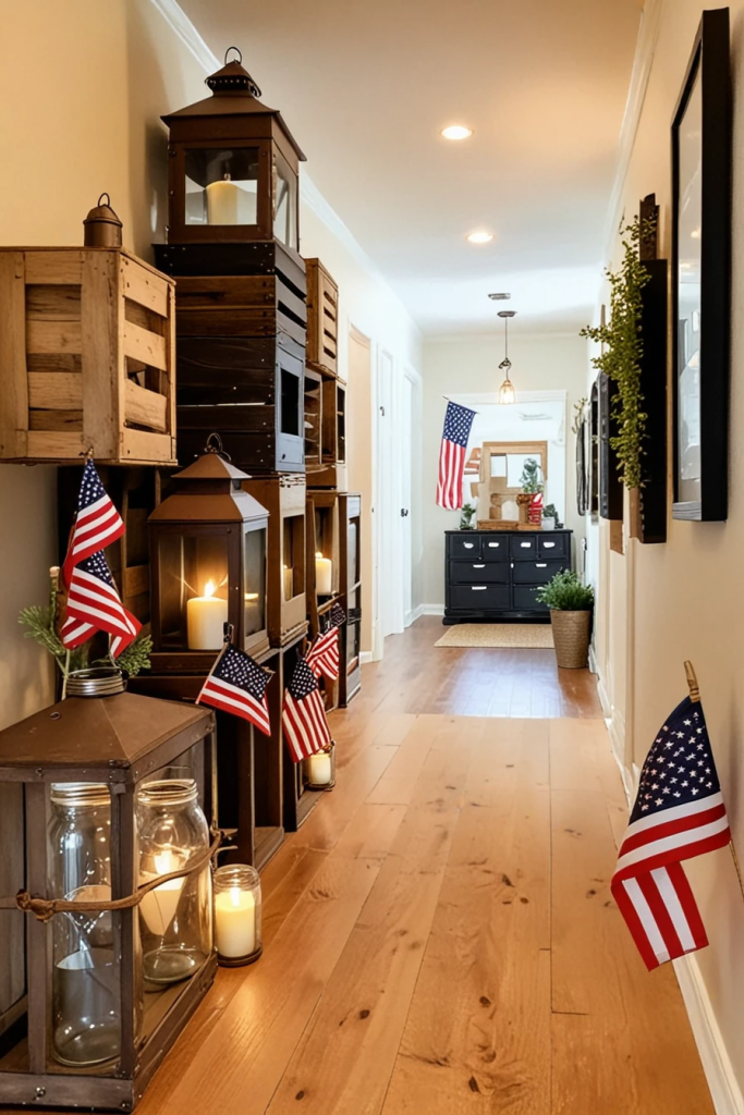 Arrange rustic wooden crates near the end of a corridor or next to a console table to serve as the perfect foundation for a scene. Use black or bronze lanterns, small mason jars dressed in red and white twine, and flag motifs of the United States as decoration. The blending of these different fabrics gives charm to the display while working especially well in homes with wooden or farmhouse furniture. An idea which is practical in its upkeep and rich in its decoration for the corners of hallway spaces.