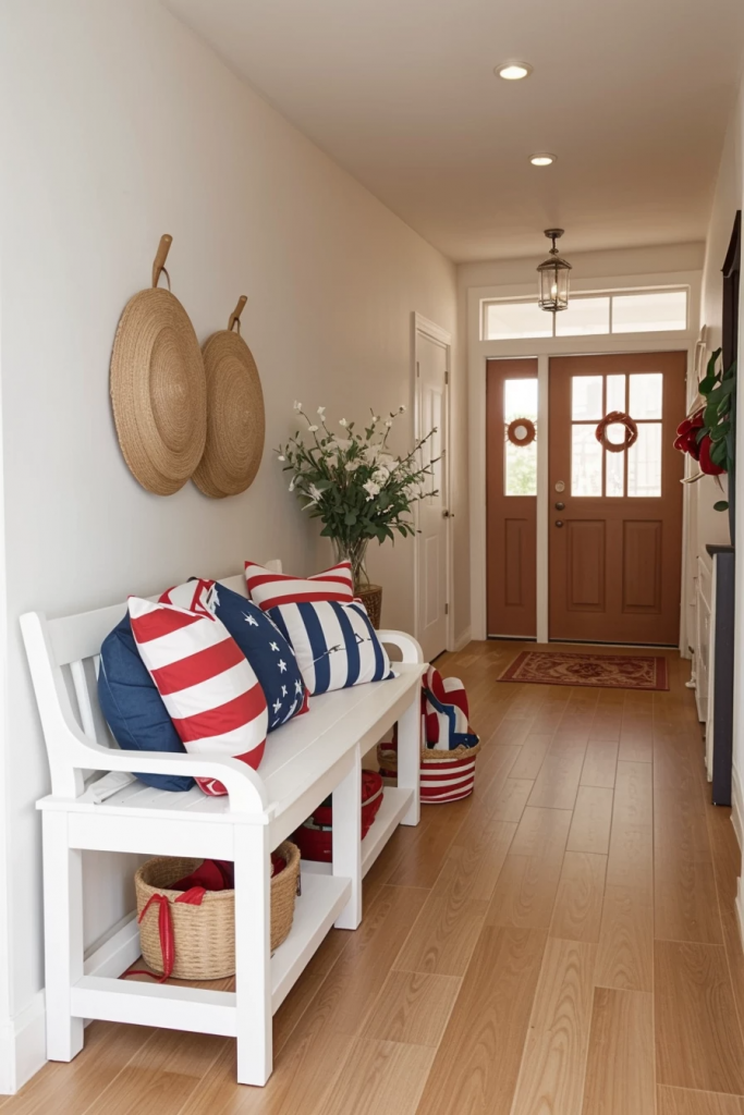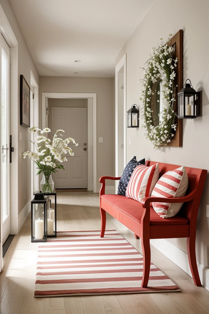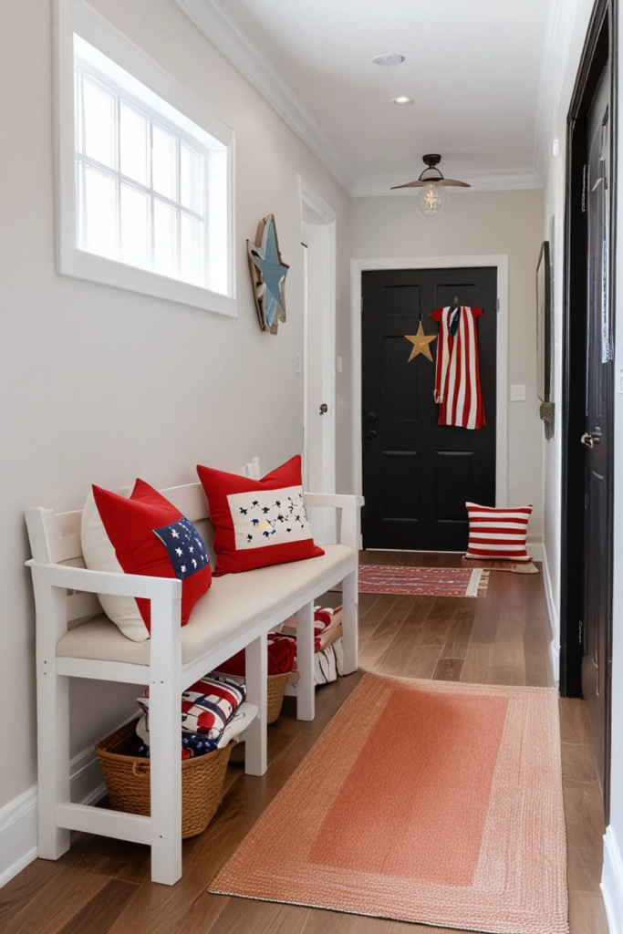 If your hallway has a bench or built-in seating, accessorize it with pillows that have USA designs on them. Look for marks that feature stars and stripes or basic red and blue colors. Place the pillows on a neutral cushion or white bench to create a vivid contrast. Not only does this design tip add comfort and invite people, but it also incorporates seasonal decorations effortlessly. This tip is easy, festive, and enhances the entire seating area.