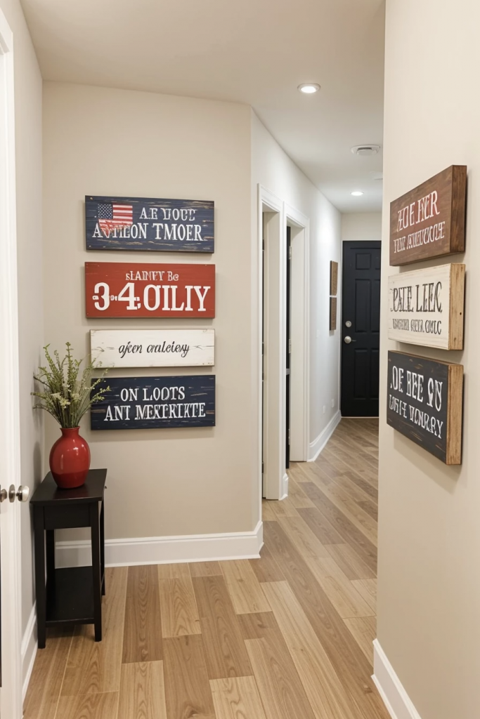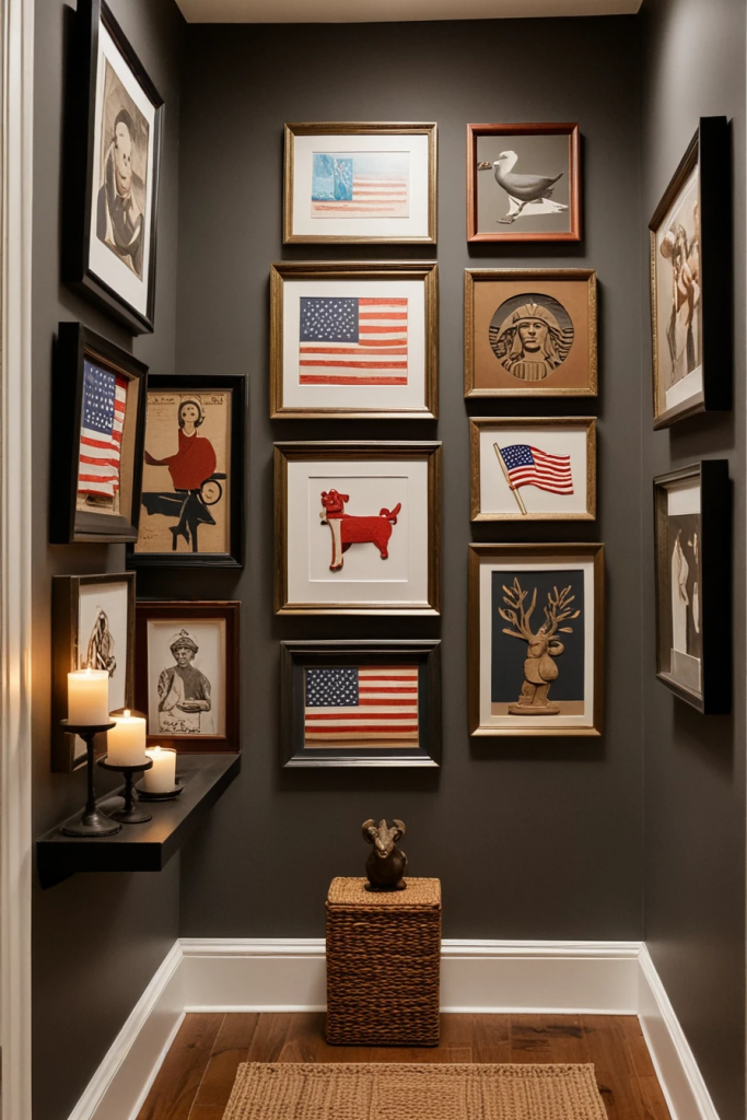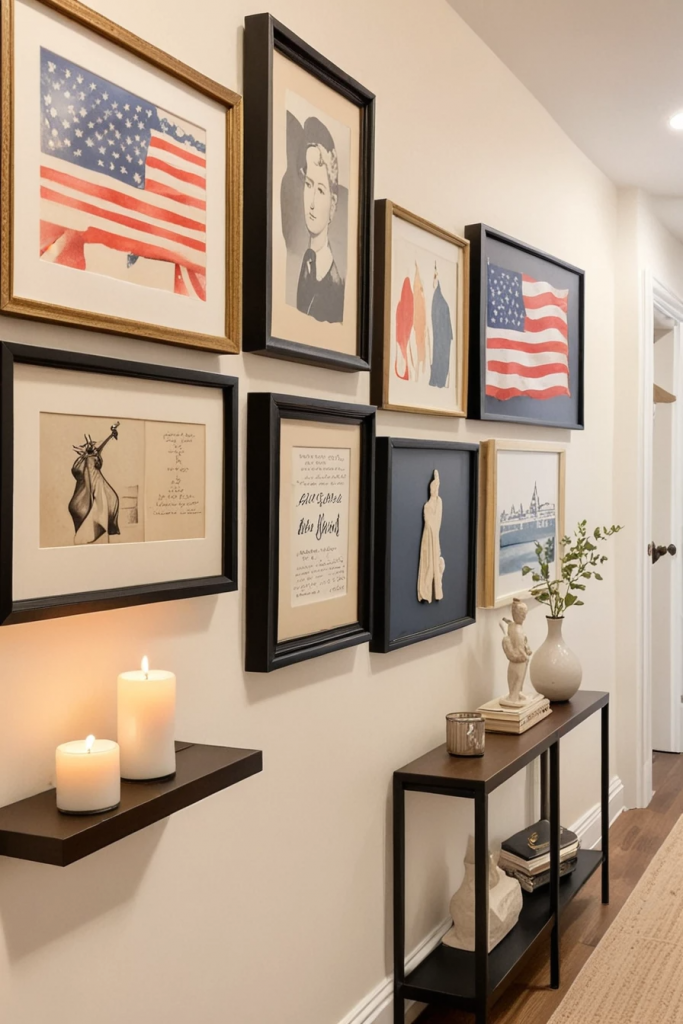 Transform a stark hallway wall into an eye-catching gallery by adding framed patriotic prints. Use a striking arrangement of modern flag artwork, American posters, and typography celebrating freedom. Formatted frames of different sizes should still be kept in line for uniformity and better visual impact. To enhance further visual interest and make use of hallway space, place small ledges or floating shelves that hold candles or miniature sculptures. This transforms blank wall space into an engaging visual experience.