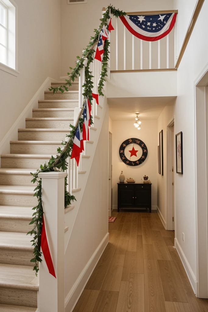If your hallway has a staircase, spruce up the staircase rails with holiday decorations. You could use flag themed ribbons, bunting, or string lights shaped like stars. Achieve balance by keeping the lower steps uncluttered while drawing attention towards the middle and top railings. It allows for a seamless connection between the vertical and horizontal spaces while making the decoration sight pleasing.