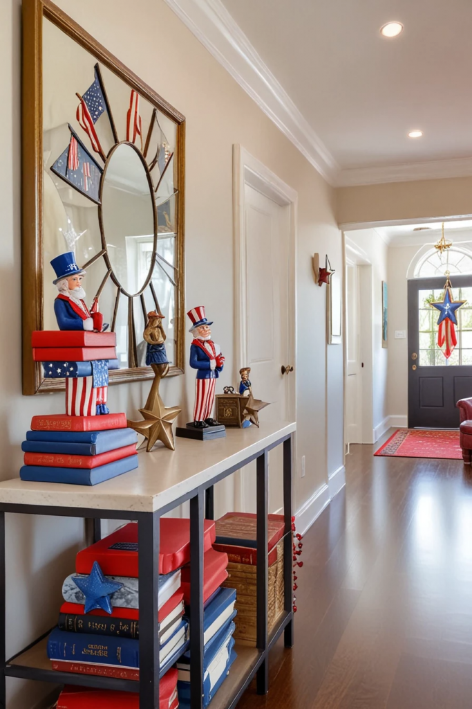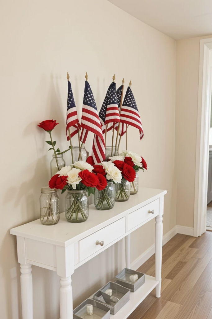To make the centerpiece stand out, add in some small American flags to the hall table, then combine them with mason jars, fresh or faux flowers in themed colors alongside star figurines or candle holders cast in metal. Note that the arrangement should carefully maintain balance to keep up appearances, not overly busy nor underwhelming. This minor yet impactful design feature marks the not-so-distant patriotic holiday while simultaneously serving as the focal point for the entire hallway.