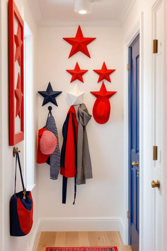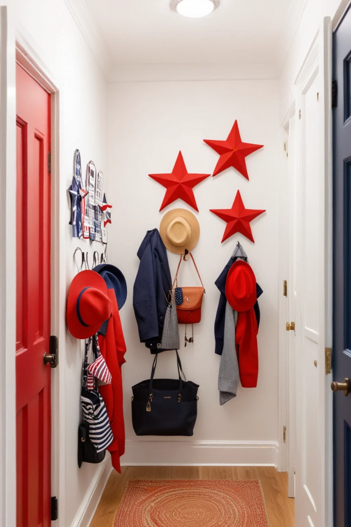 Replace everyday wall hooks with star-spangled ones that go with your 4th of July decor. These accents are very useful as they can help hang jackets, hats, and can even serve as holiday accessory holders. These hooks are painted with wood or metal in classic American red, gold, or navy. Placing the hooks by the entrance or along the hallway serves a dual purpose as they are strategically useful and aesthetically pleasing. This design merges practicality with 4th of July decoration seamlessly.
