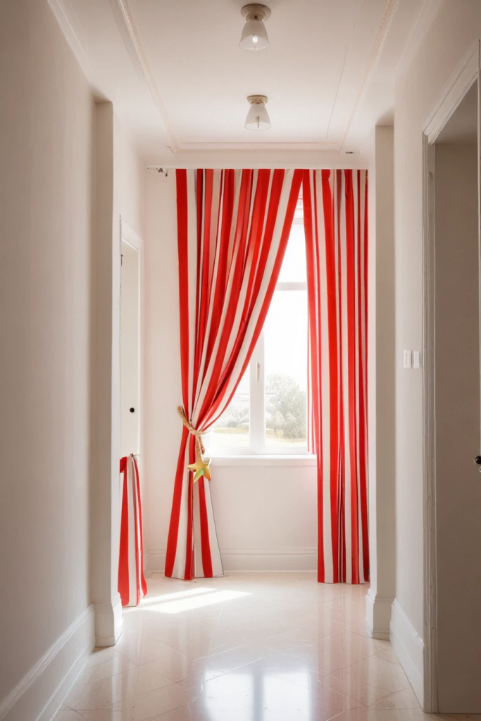 Stripped drapes in classic American colors bring movement and texture into framed windows or open archways in the hallway. For coherence with other furnishings in the house, use nowadays upholstery with vertical red, white, and blue stripes. Little star or rope tiebacks are captivating embellishments. These curtains can also gently divide longer hallways or cut off entryways while still permitting an unobstructed sight line. It’s an elegant method of incorporating soft fabrics into the corridors’ decor.