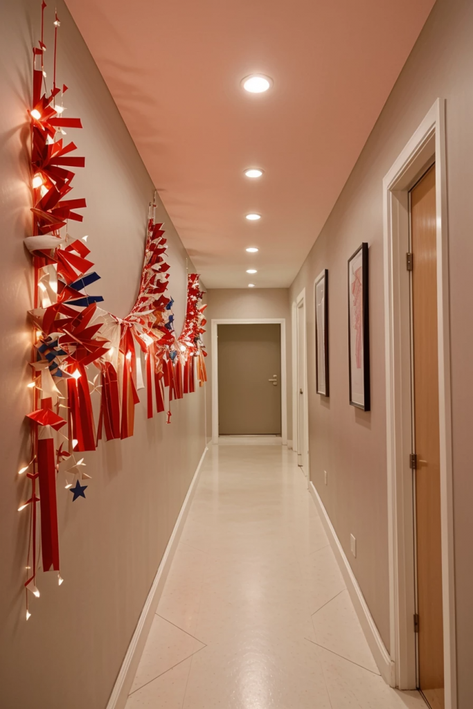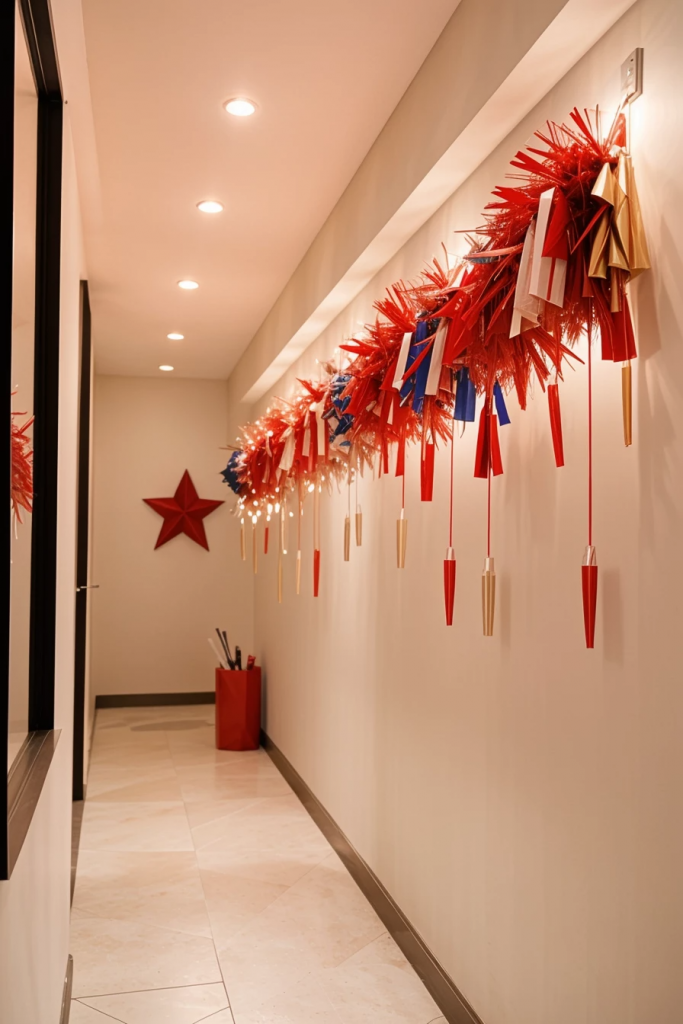 To energize your hallway or door frames, consider hanging a firecracker garland to make them stand out. Make sure to choose ones with glittering paper rockets, metallic tassels, or mini flag designs. These decorations add movement and are great for energizing dull long hallways. Add the finishing touch by scattering colored LED lights or matching wall stickers to the wall to enhance rhythmic order.