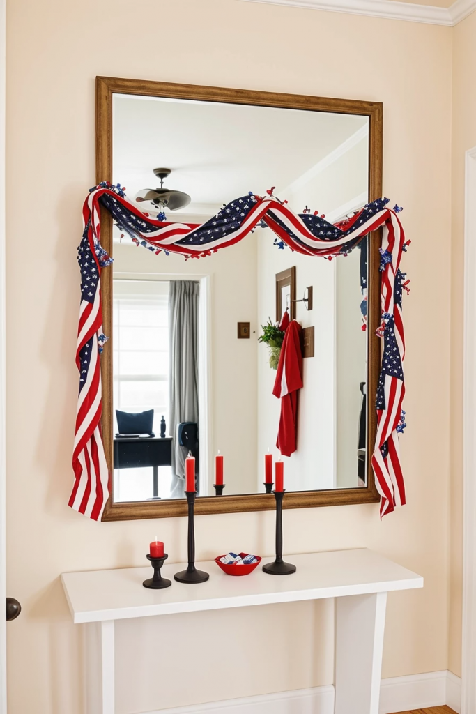 Make your hallway mirrors more festive for Independence Day by bordering them with decorations such as mini flag bunting, star-shaped stickers, and flag garlands. To spruce things up a bit, you can also place a small shelf under the mirror and decorate it with seasonal items like candle holders in the shape of stars or glass vases filled with blue marbles. Doing this creates a frame for the mirror which serves as a patriotic centerpiece. The mirror’s reflection shows the rest of your hallway decor and enhances the effect. Not only does this help in decorating the space, but also makes it feel more dynamic.