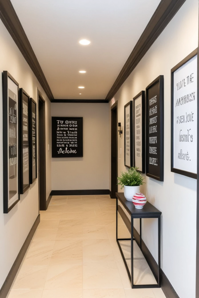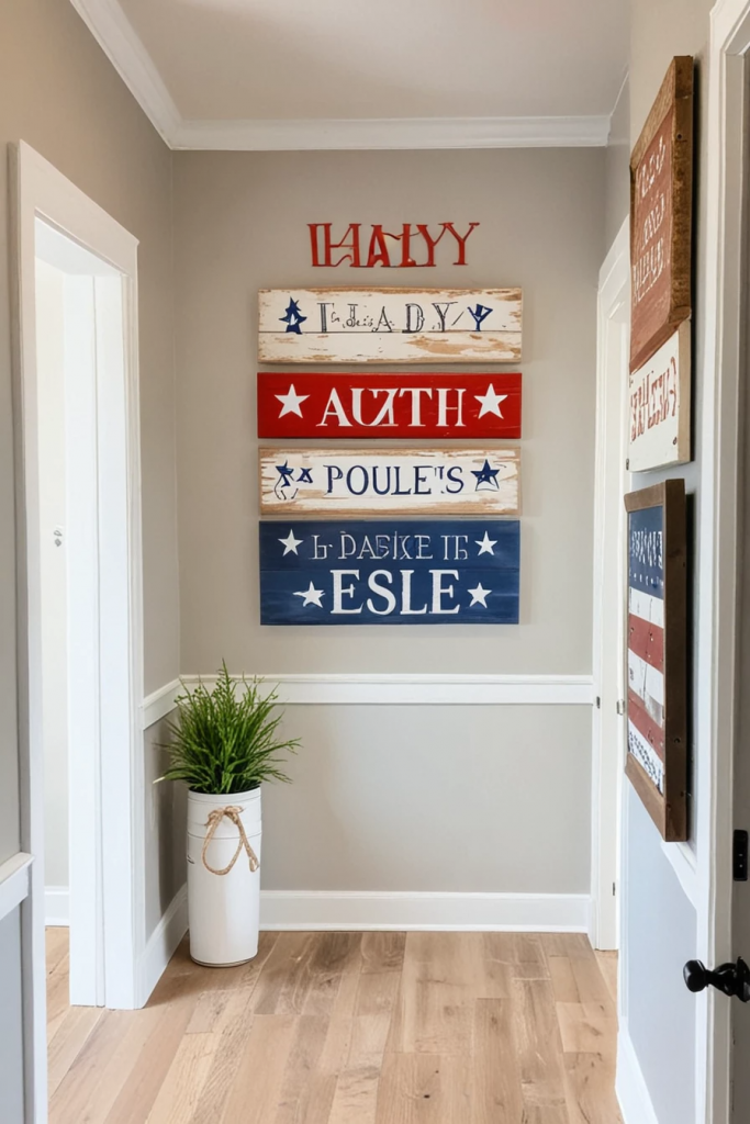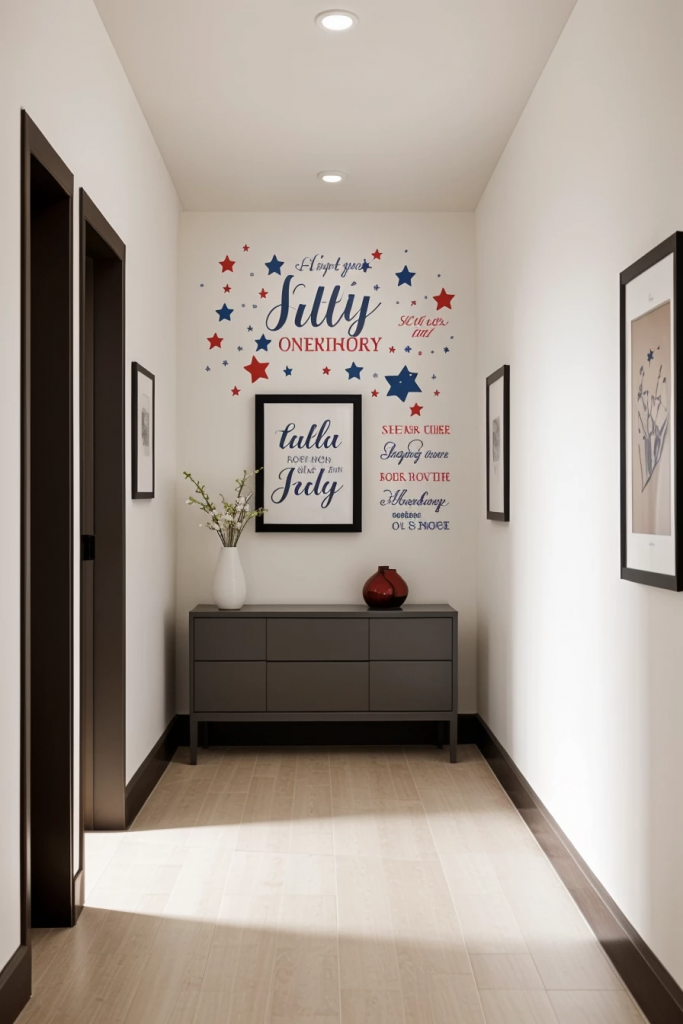 Add your own personal touch to the hallway by adding quotes that encompass the spirit of freedom. Choose famous quotes from renowned historical figures or select contemporary prints that use striking typography templates with minimalistic designs. These prints can be hung in orderly fashion or as part of gallery walls for enhanced appeal. This technique enhances depth and meaning to your 4th of July hallway decorations while still capturing the messages of the holiday. Complete the decor using these quotes along with flags, stars, or other subtle artistic features.