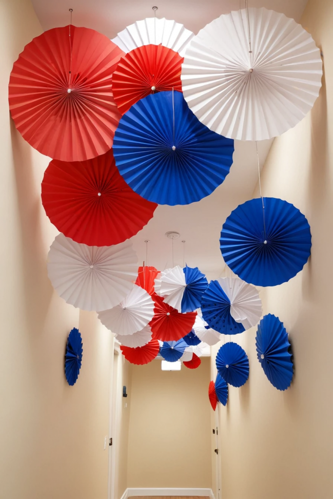 You can create movement and impact with lightweight hanging paper fans in red, white, and blue. Hang them from the ceiling at different heights and sizes, clustering around entryways and focal points and near wall art for added impact. Amazing for homes where hallways need to be kept open but still festive as these decorations don’t clutter up the floor or table space.
