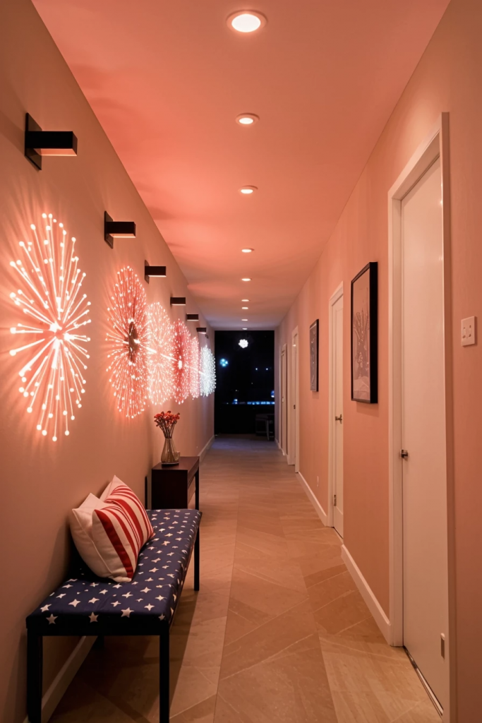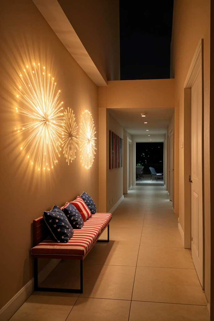 Achieve that festive spirit with firework-shaped LED wall lights. Place the lights above a person’s eye level to use as hallway accent lighting or position them like celebratory explosions throughout the corridor. These lights mix styles beautifully with their modern appearance clashing gracefully with traditional holiday decor. To finish, include a bench or stool with patriotic cushions. Beyond setting the mood, these lights are practical.