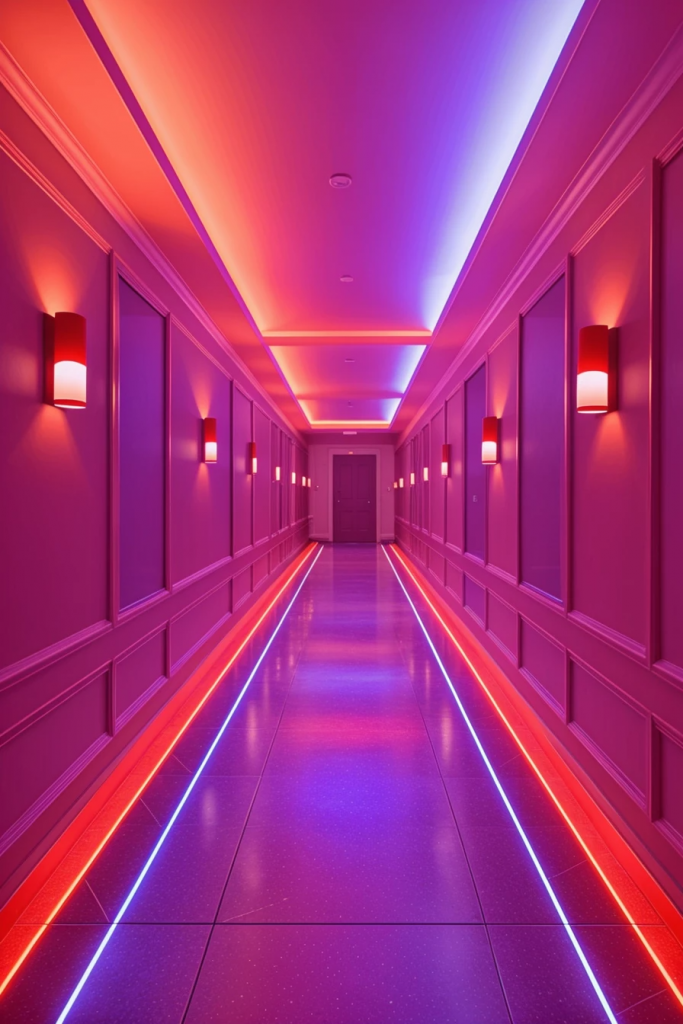 Prompted by the upcoming 4th of July holiday, indulge in hallway lighting accentuated and tinted with gentle red, white and blue hues. Strip lights can also be placed in the ceiling or floor trim giving the space a more modern feel. Subdued lighting can be achieved using color-filtered bulbs, LED strips, and wall sconces that match the theme. This approach works remarkably well within contemporary design standards whilst truly transforming the feeling of the space.