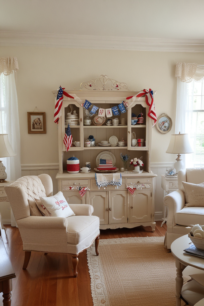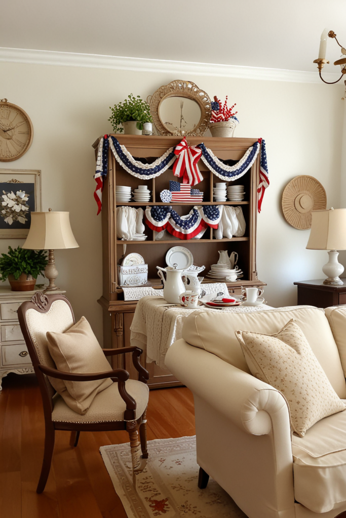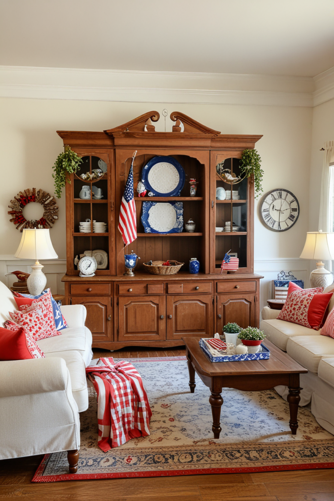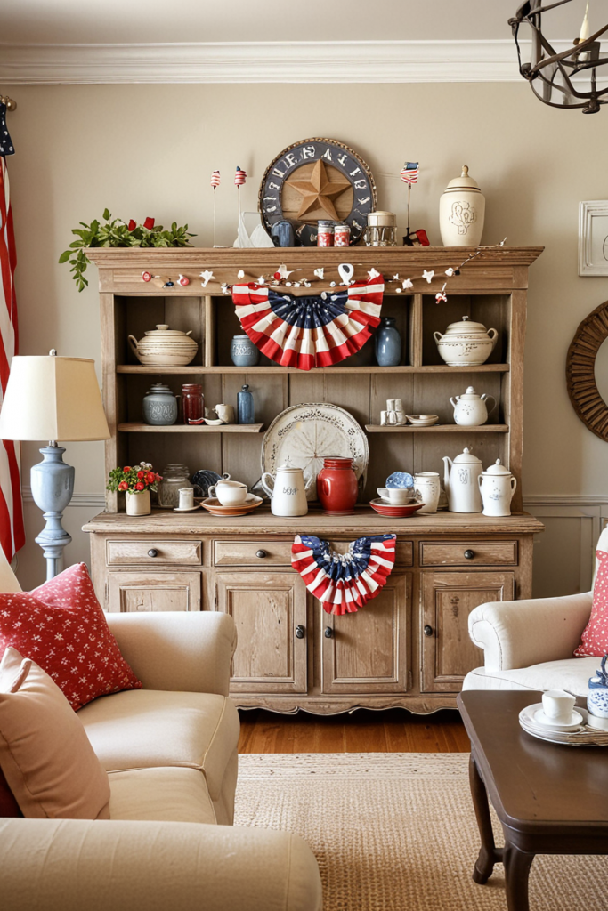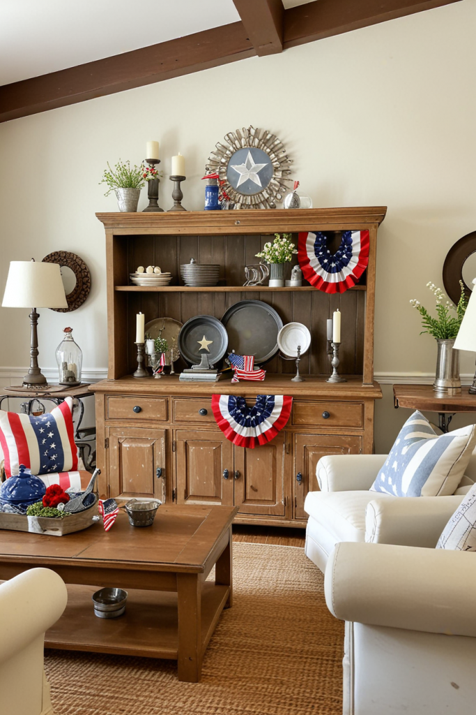 Transforming a living room for the 4th of July in a vintage style requires precision as one combines sophistication with patriotism. One adds history to the space by styling the hutch with aged wood finishes, faded flags, and vintage Americana collectibles. Complete this look with red, white, and blue touches like fabric book covers and crafted décor pieces. Everything remains elegant yet comfortable, and the 4th of July hutch decor stores effortlessly into a heritage rich home.