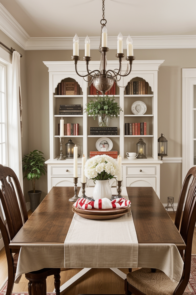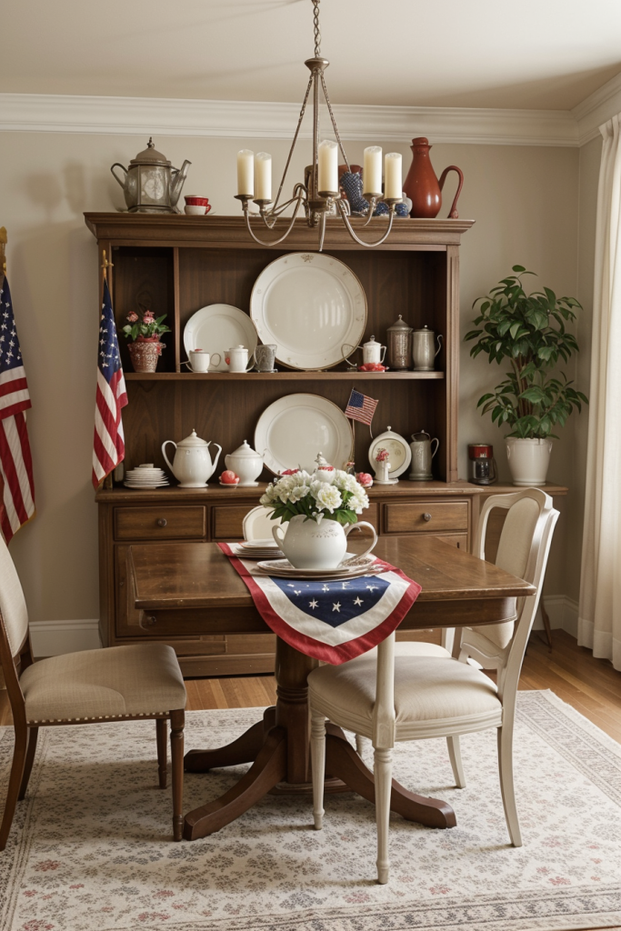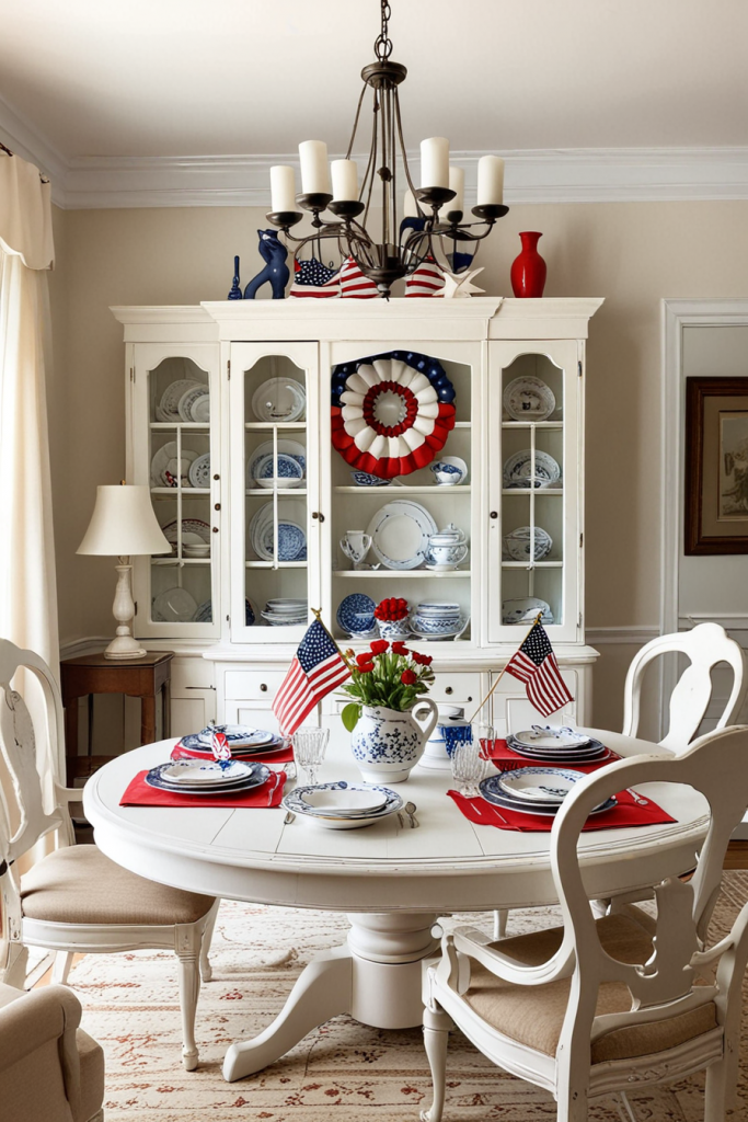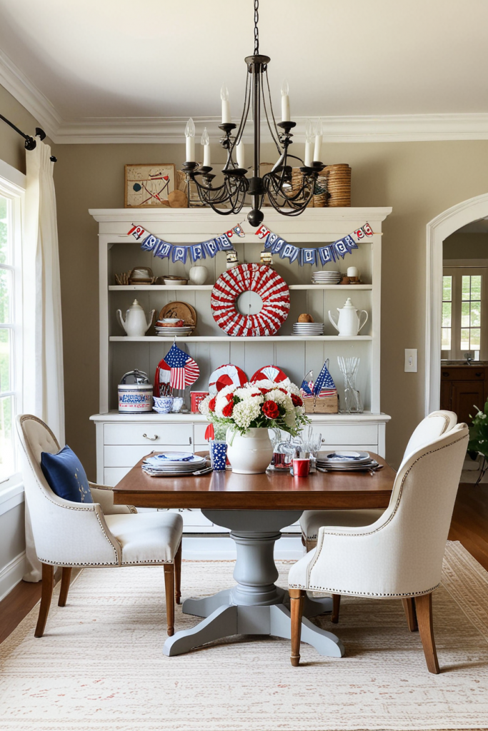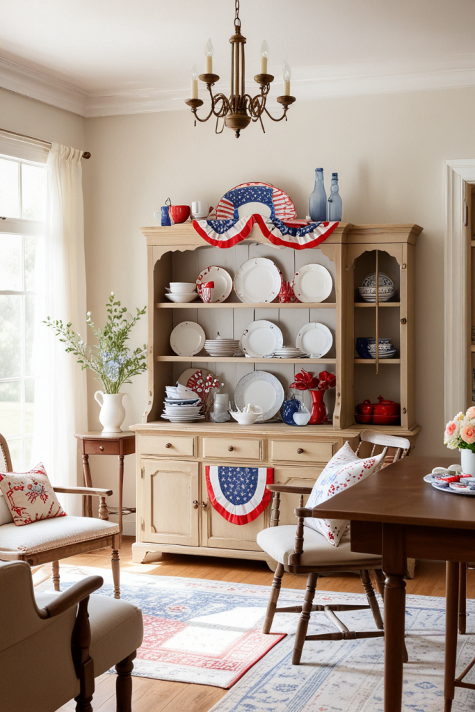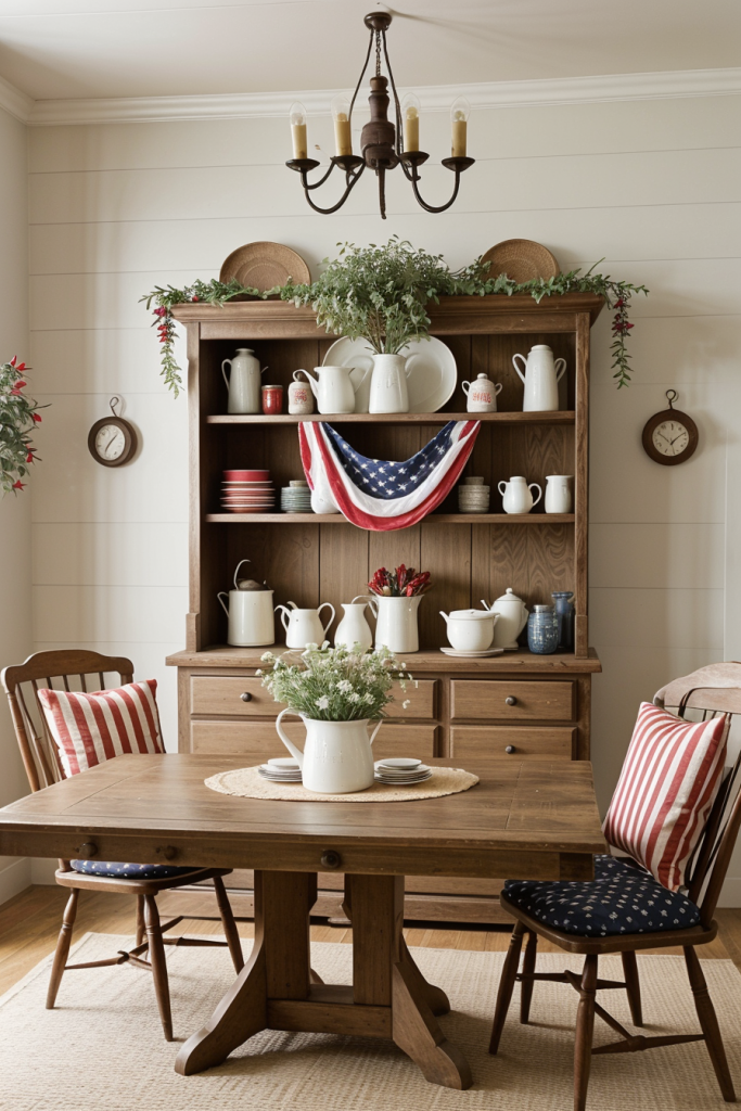 If you are someone who appreciates transitional interiors, incorporating modern grandeur with a vintage 4th of July decor gives a styled, designer interior. Incorporating a simple hutch in neutral shades will work well combined with vintage bunting including aged tins and subtle textures like navy, crimson, and cream. Use contemporary lighting or a streamlined hugging dining table to avoid clutter in the room.
