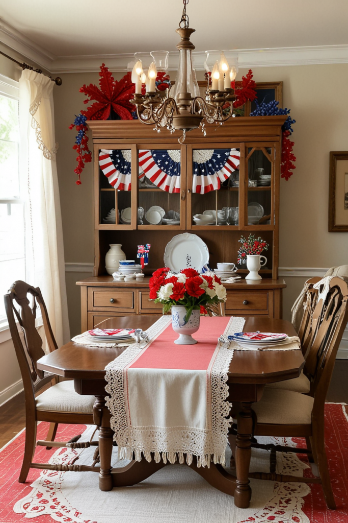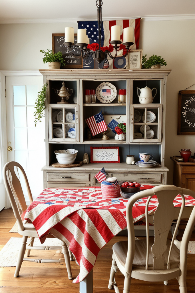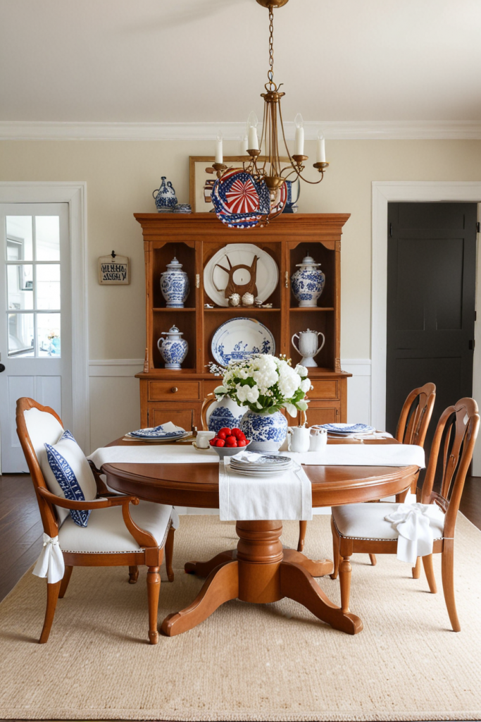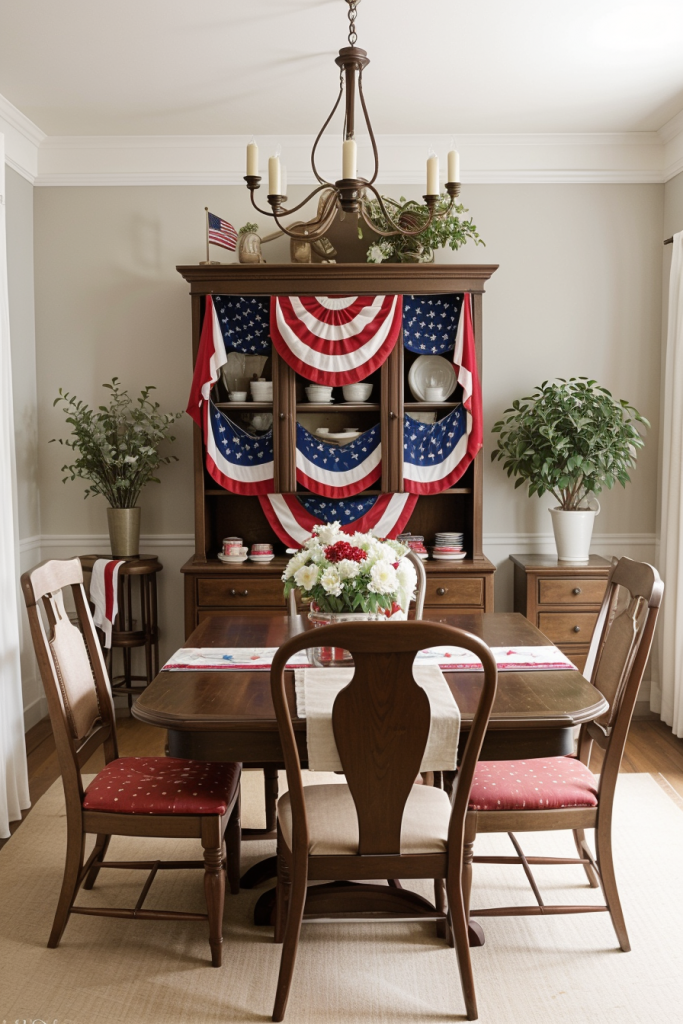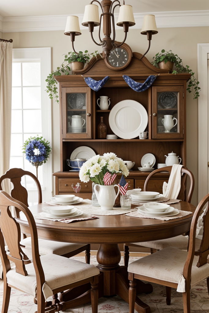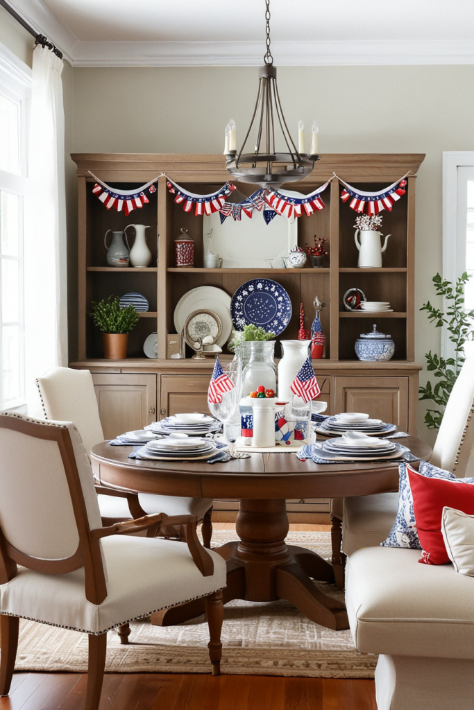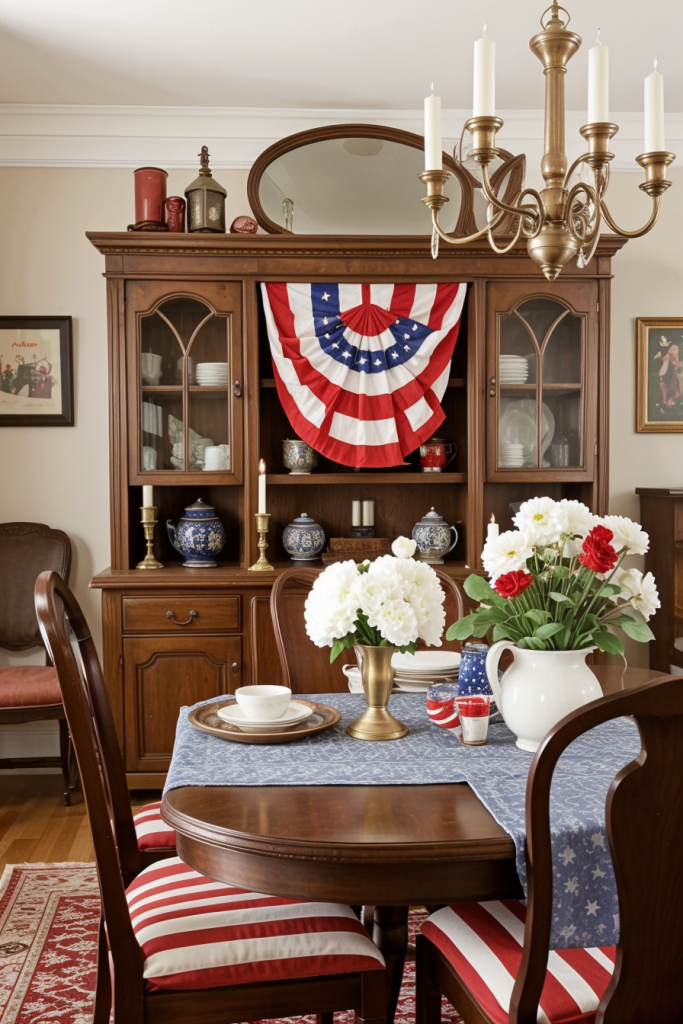 If you are someone who appreciates transitional interiors, incorporating modern grandeur with a vintage 4th of July decor gives a styled, designer interior. Incorporating a simple hutch in neutral shades will work well combined with vintage bunting including aged tins and subtle textures like navy, crimson, and cream. Use contemporary lighting or a streamlined hugging dining table to avoid clutter in the room.