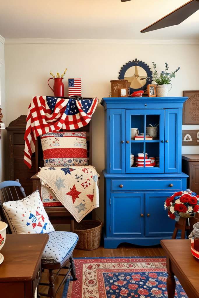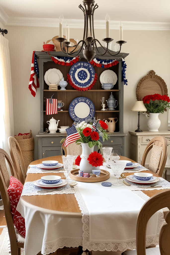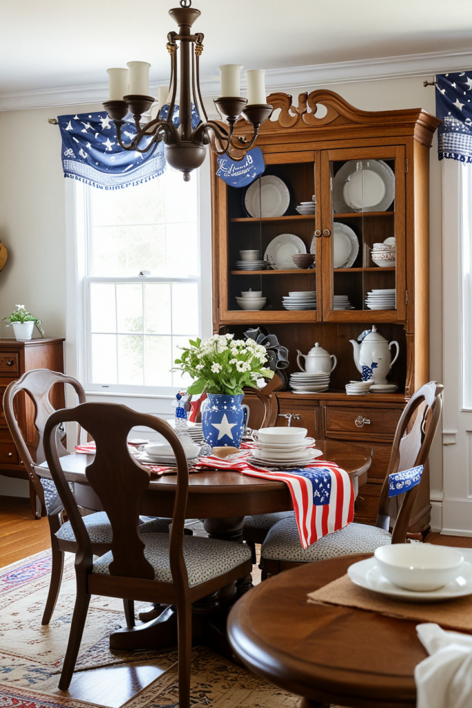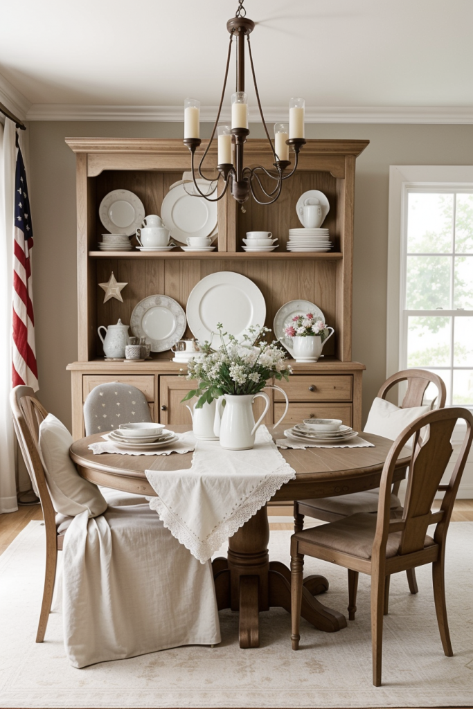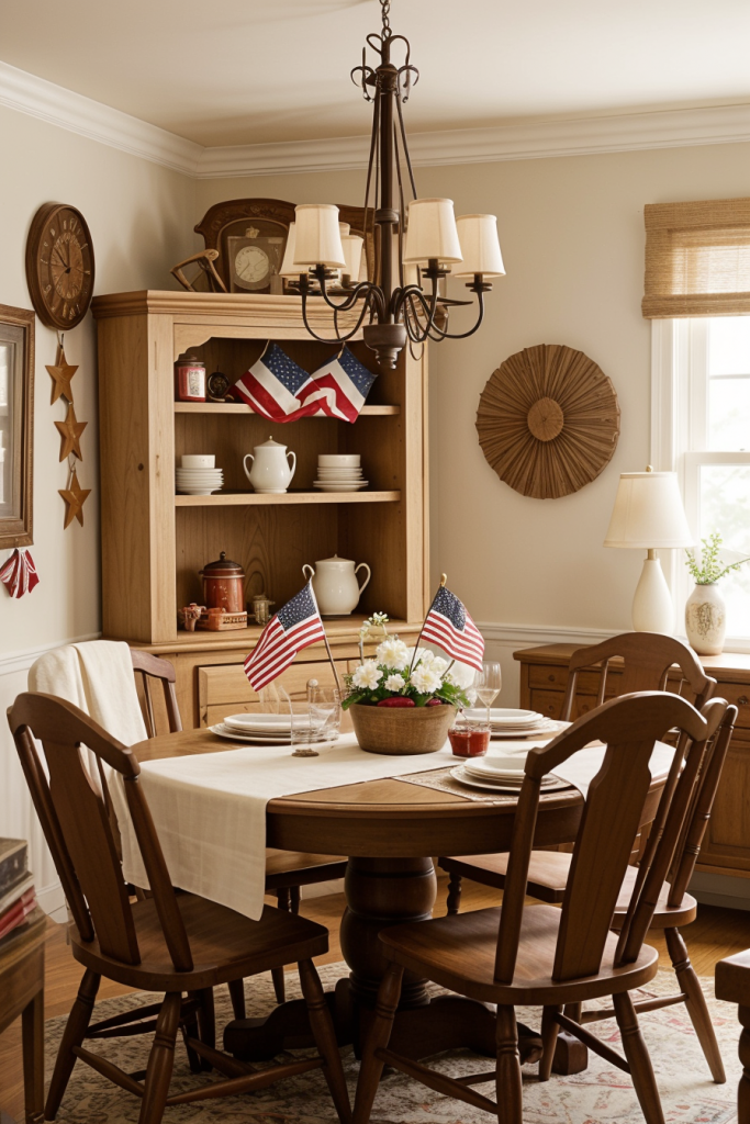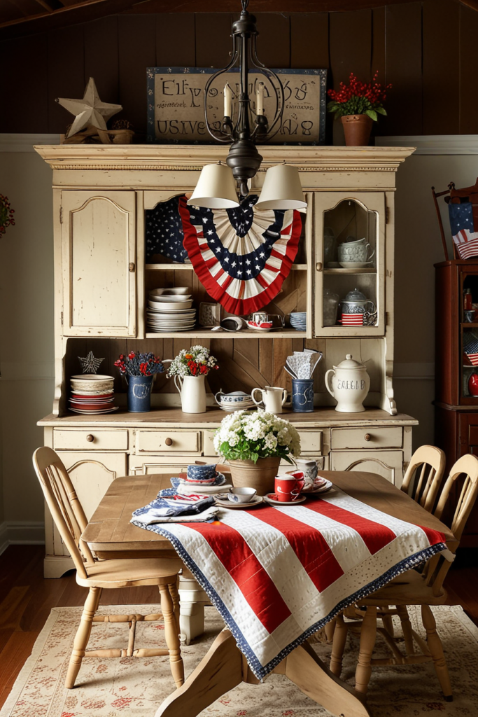 Not every flag-themed décor has to be over the top. Subtle stars and stripes can bust be stylish and artistic. You can incorporate tapestry napkins, carved wooden stars, or hand-painted dishes beside antique jugs and bowls. The gentle and subtle incorporation of these motifs deepens the vintage charm. This design works exceptionally well in rooms that have muted colors and soft, refined aesthetics.