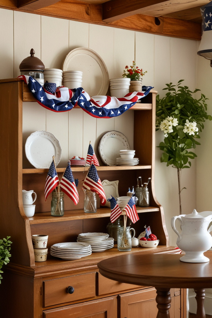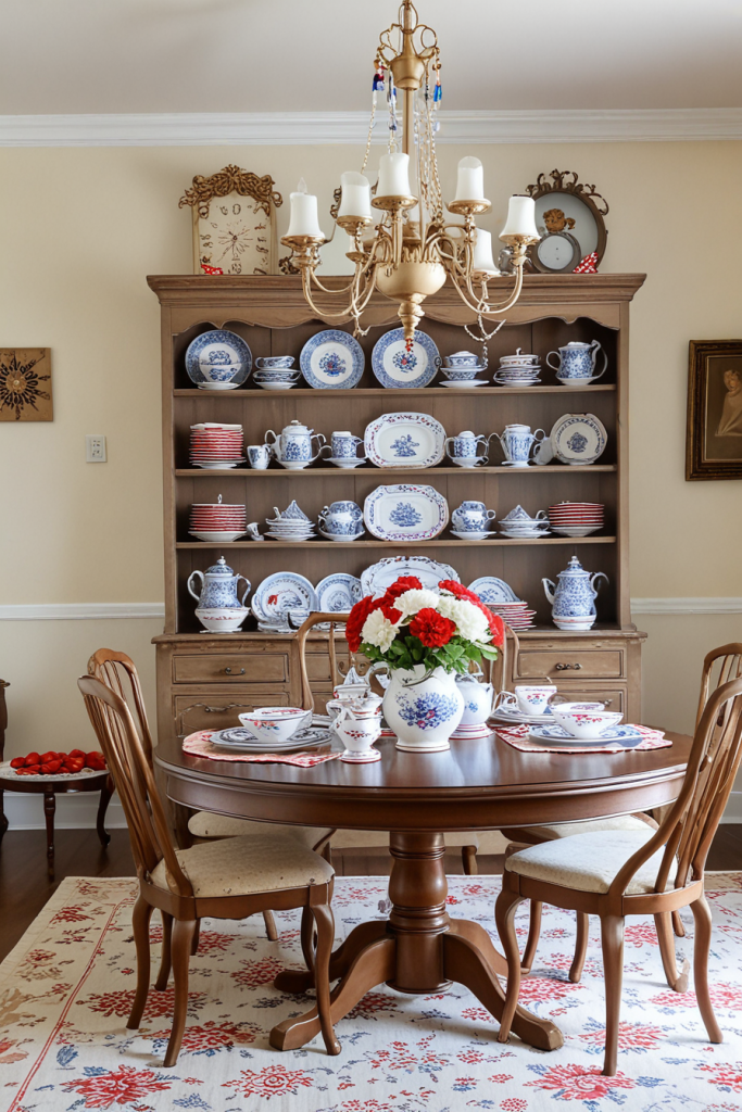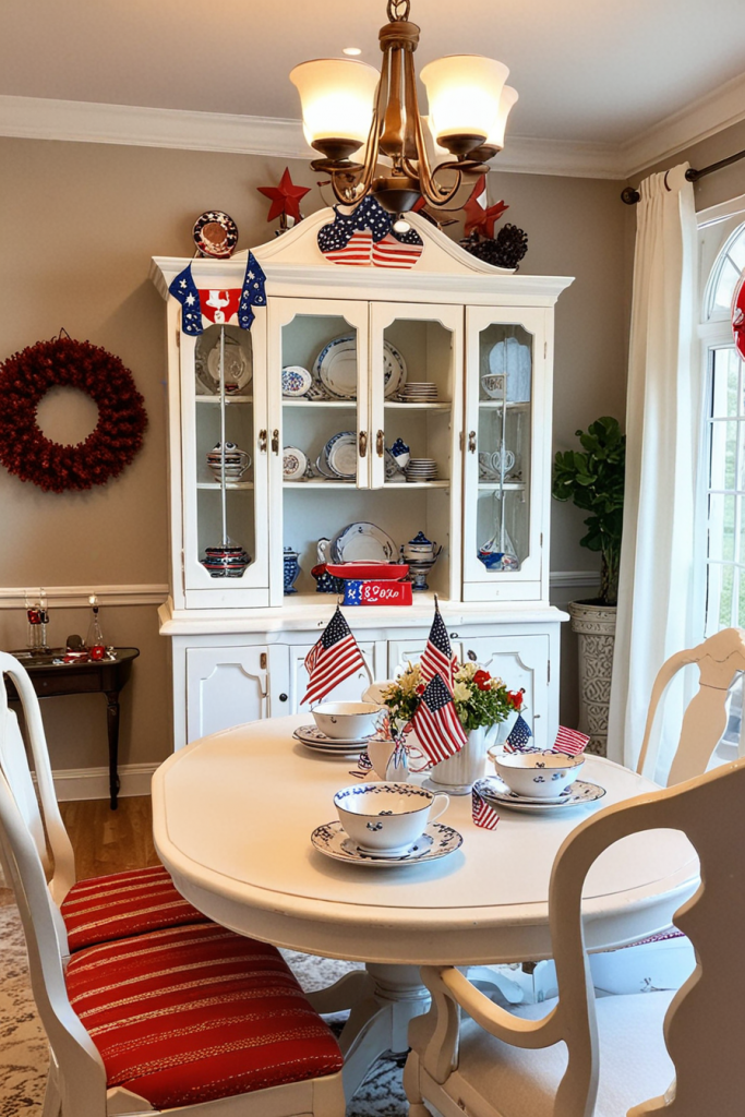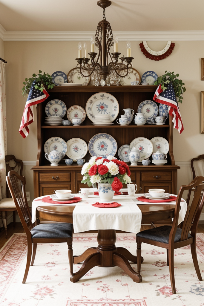 A classic china hutch sustains an ideal backdrop for celebrating patriotism with grace. To maintain elegance, choose a neutral background and adorn it with miniature American flags, star porcelain, and red and blue antique dishware. Remember—balance is crucial, and you will want to avoid overcrowding the shelves. The collection exudes a blended old-world elegance with decor that feels both elevated and heartfelt.