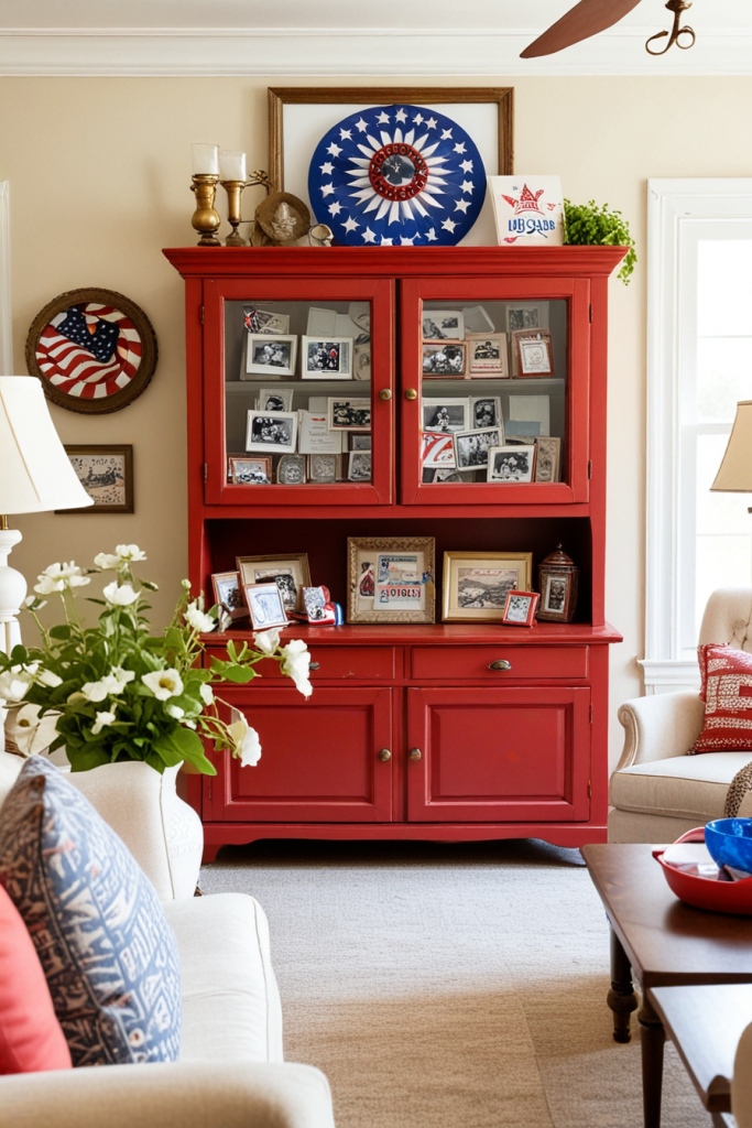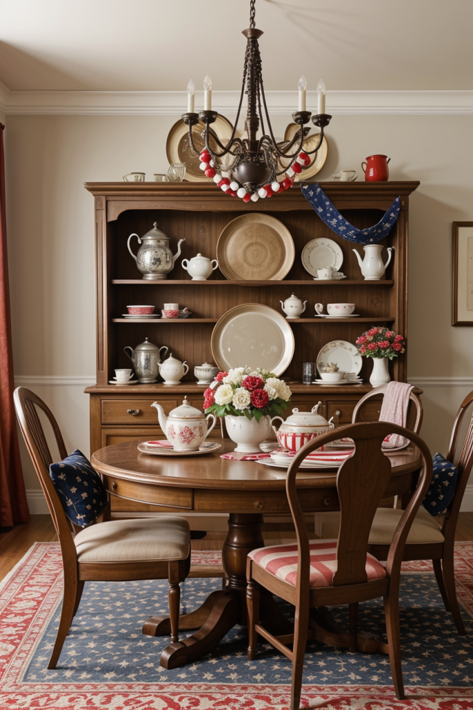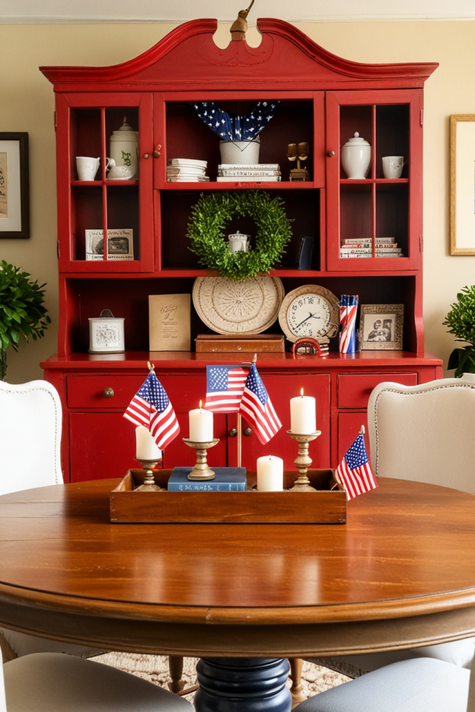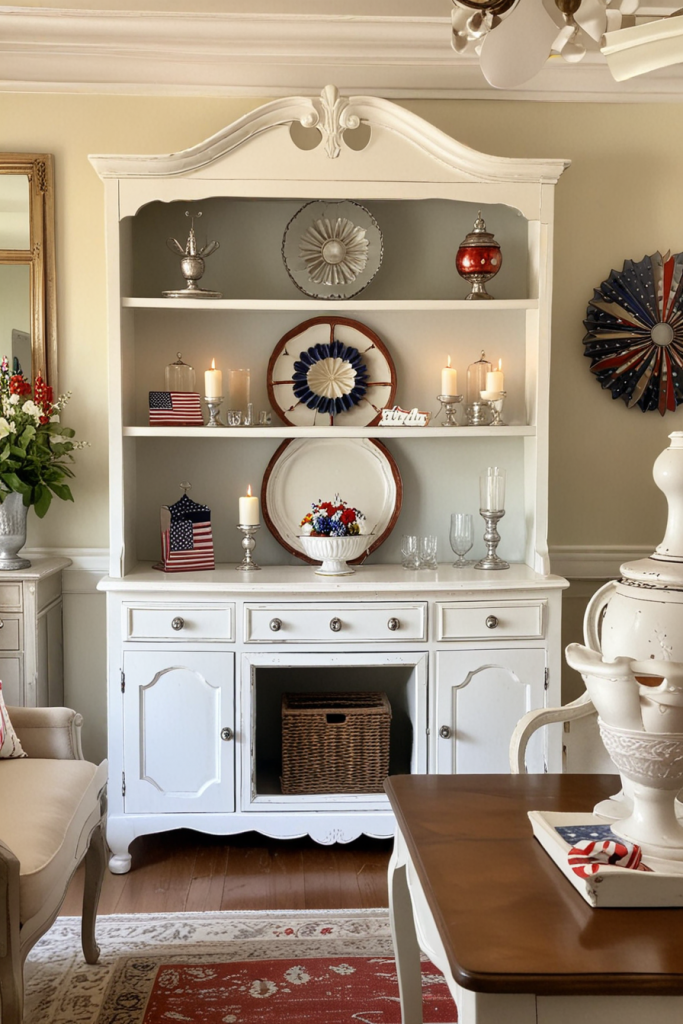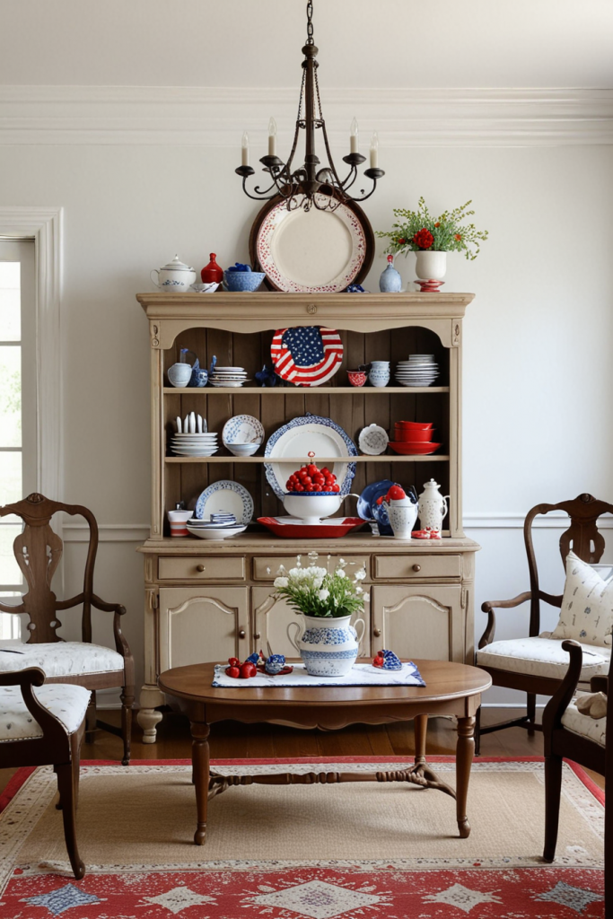 Using vintage treasures adds authentic charm to your 4th of July hutch decor. Blended with classic touches of red and blue, a family silver teapot collection or a passed down serving tray transforms into the focal point of your hutch display. cherised heirlooms foster a sense of deep history and allow you to tell a story through your decor. This approach intertwines festivity and legacy seamlessly.